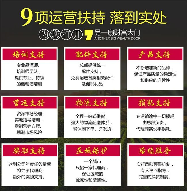 为了助力各位朋友都能打开财富大门,佐恩酒业现特设置了低门槛招商,以及全方位的市场扶持政策,全程追踪,保姆式服务,为经销商提供更大的支持,帮助经销商打开市场。