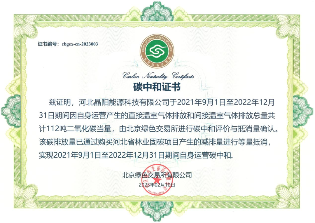晶首碳资产公司所属母公司-河北晶阳能源科技有限公司通过购买降碳产品实现自身运营碳中和