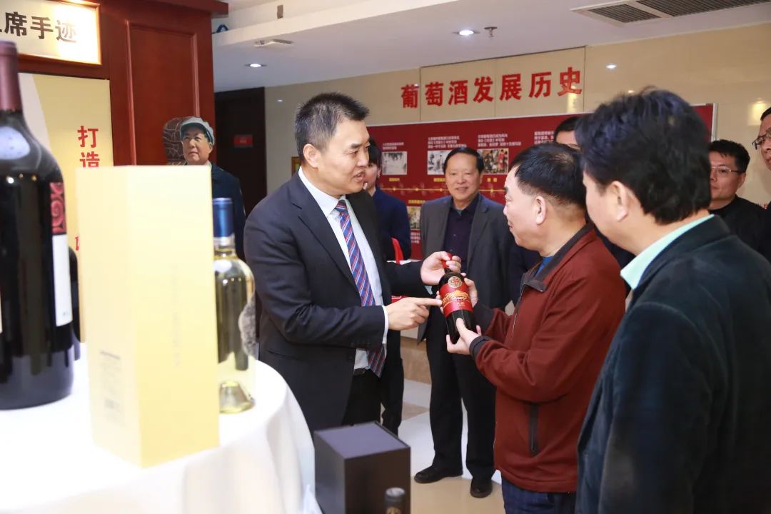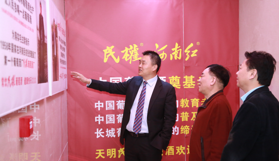 在天明集团创始人兼董事长、天明民权葡萄酒荣誉董事长姜明,天明民权葡萄酒董事长马丹的陪同下,刘海董事长一行先后参观了天明集团企业文化墙、民权葡萄酒文化博物馆等,全面细致的了解天明民权葡萄酒的企业文化、发展历程,感受天明民权葡萄酒品质第一、以匠心酿好酒的理念。