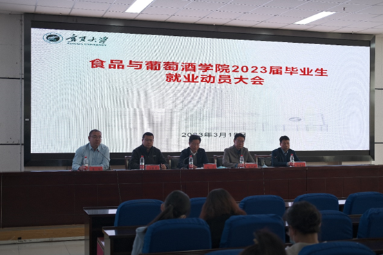 为深入学习贯彻党的二十大精神,落实党中央、国务院 “稳就业”“保就业”决策部署,抢抓春季开学后促就业工作关键期,全力促进毕业生顺利就业、尽早就业。食品与葡萄酒学院于2023年3月15日举办了2023届毕业生就业动员大会。本次会议由学生工作办公室主任曹洋主持,学院党委书记张宁、副院长张军翔、党委副书记马浩谦、副院长方海田、徐伟荣,全体教师以及2023届毕业生参加。