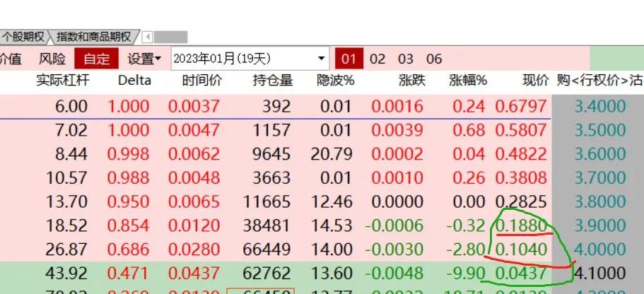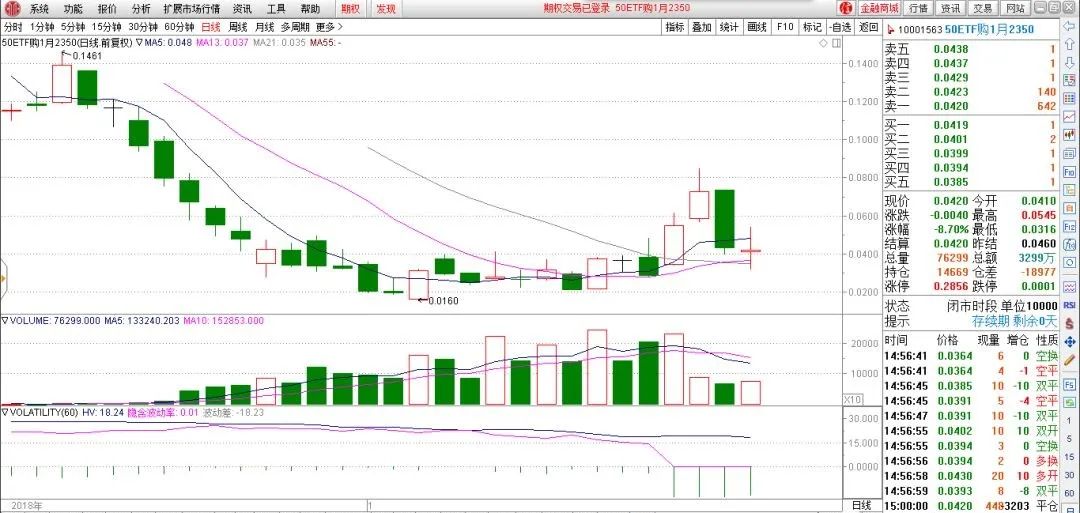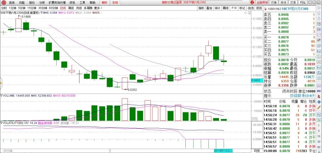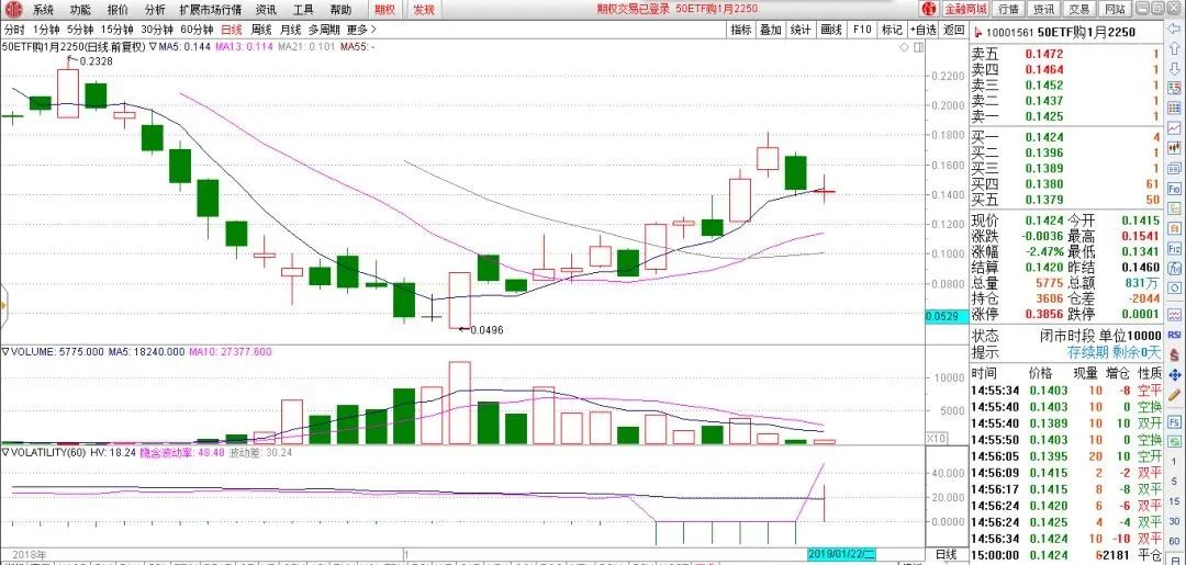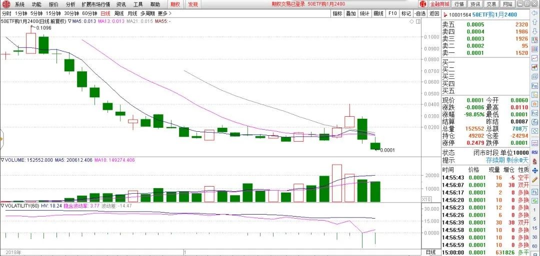 后来1月份行权日刚好涨到2.4元附近,平值附近的期权走势如图5-图8: