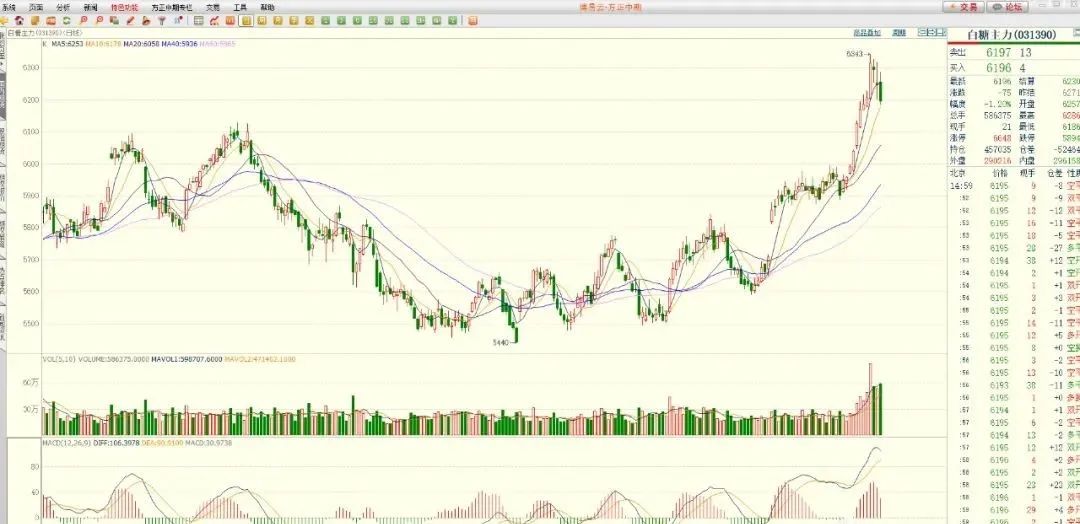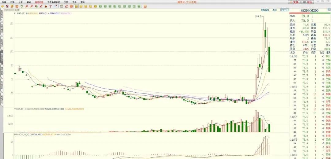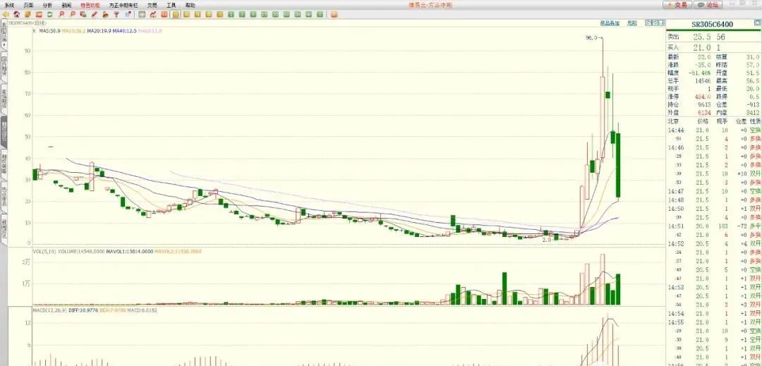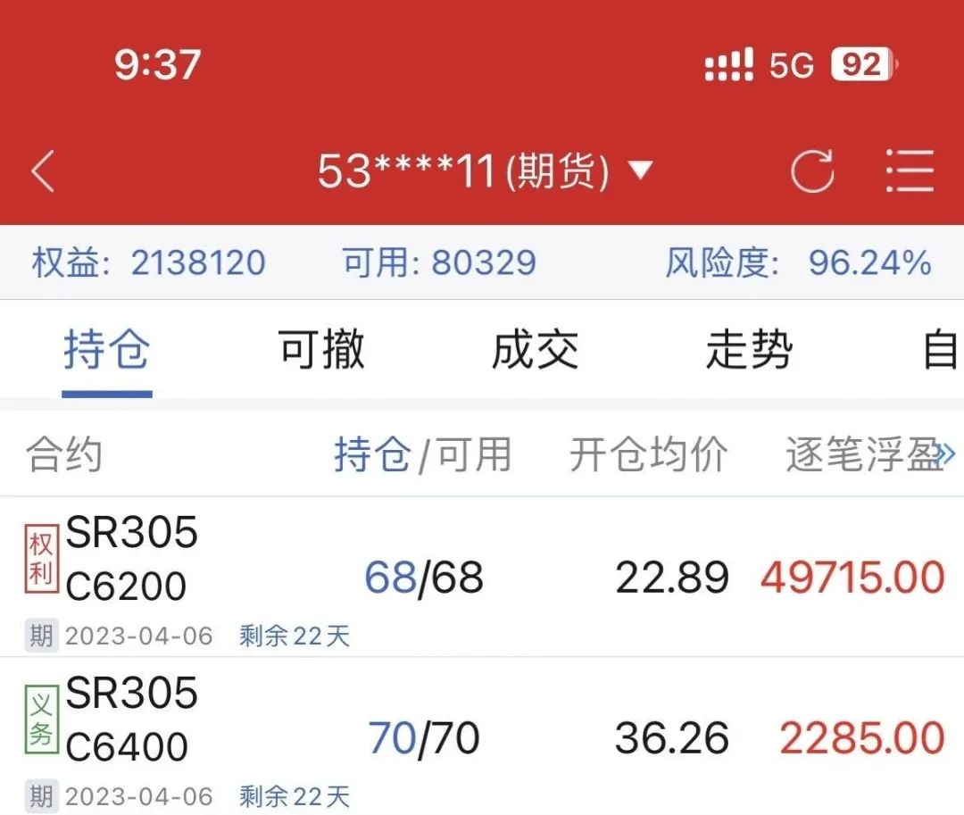 众所周知,我之前在低位买了6200购,翻两倍平一半后拿着,后来加仓卖出了6400购,前几天的冲高过程中,一度买方赚很多,买方浮亏两三万的情况。