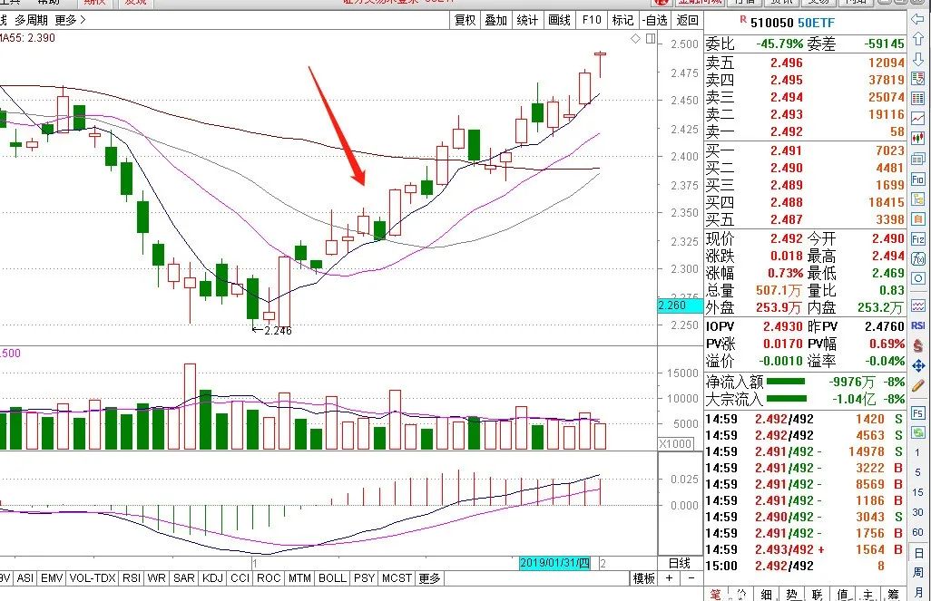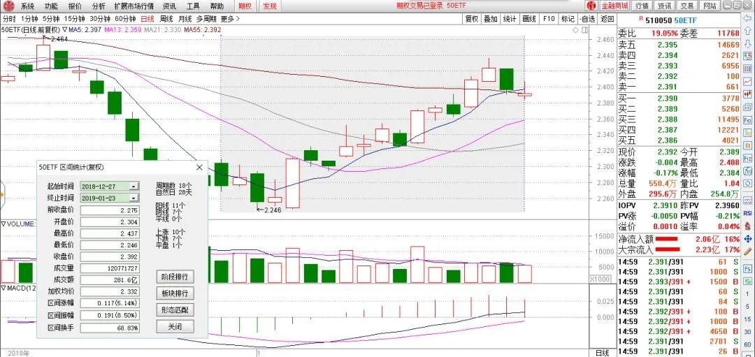 如图4所示的2019年1月份行情,经历了2018年上半年的调整和下半年的震荡,终于在2019年1月4日左右见底开始反弹,但是刚开始反弹的力度如何,大家都没底,只好尝试性做多,却又不敢用买入虚值认购的方式来做多。于是试图构建图2中的牛市价差。
