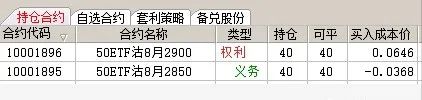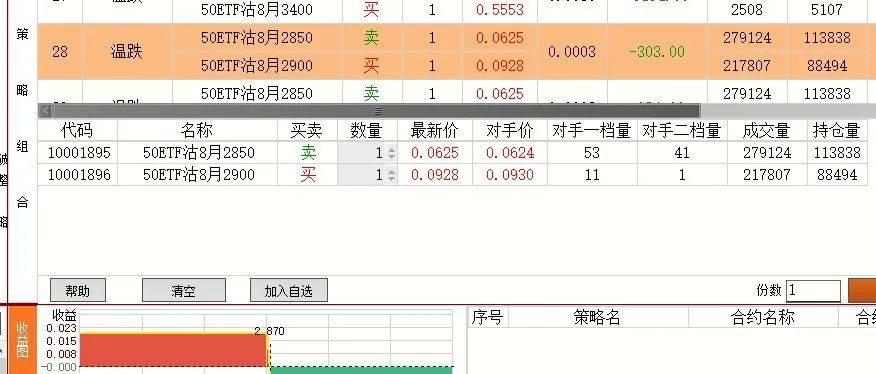 如图3,买入50ETF沽8月2900,卖出50ET沽8月2850,理论上最大收益和最大亏损都是有限的,最大收益是标的下跌达到或超过卖出期权的行权价,最大收益金额为标的在该位置及以上的两者权利金之差再减去净权利金支出,最大亏损理论上是买入的期权合约和卖出的期权合约都归零,亏损为目前两者权利金之差,为303元/组。