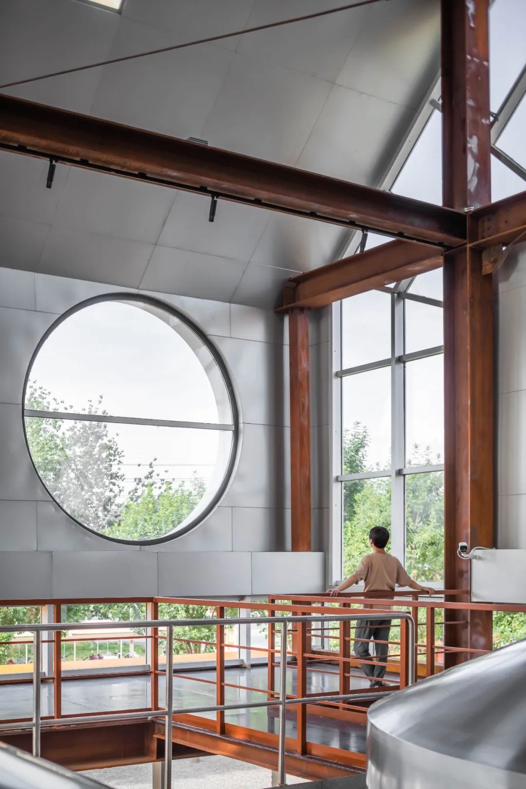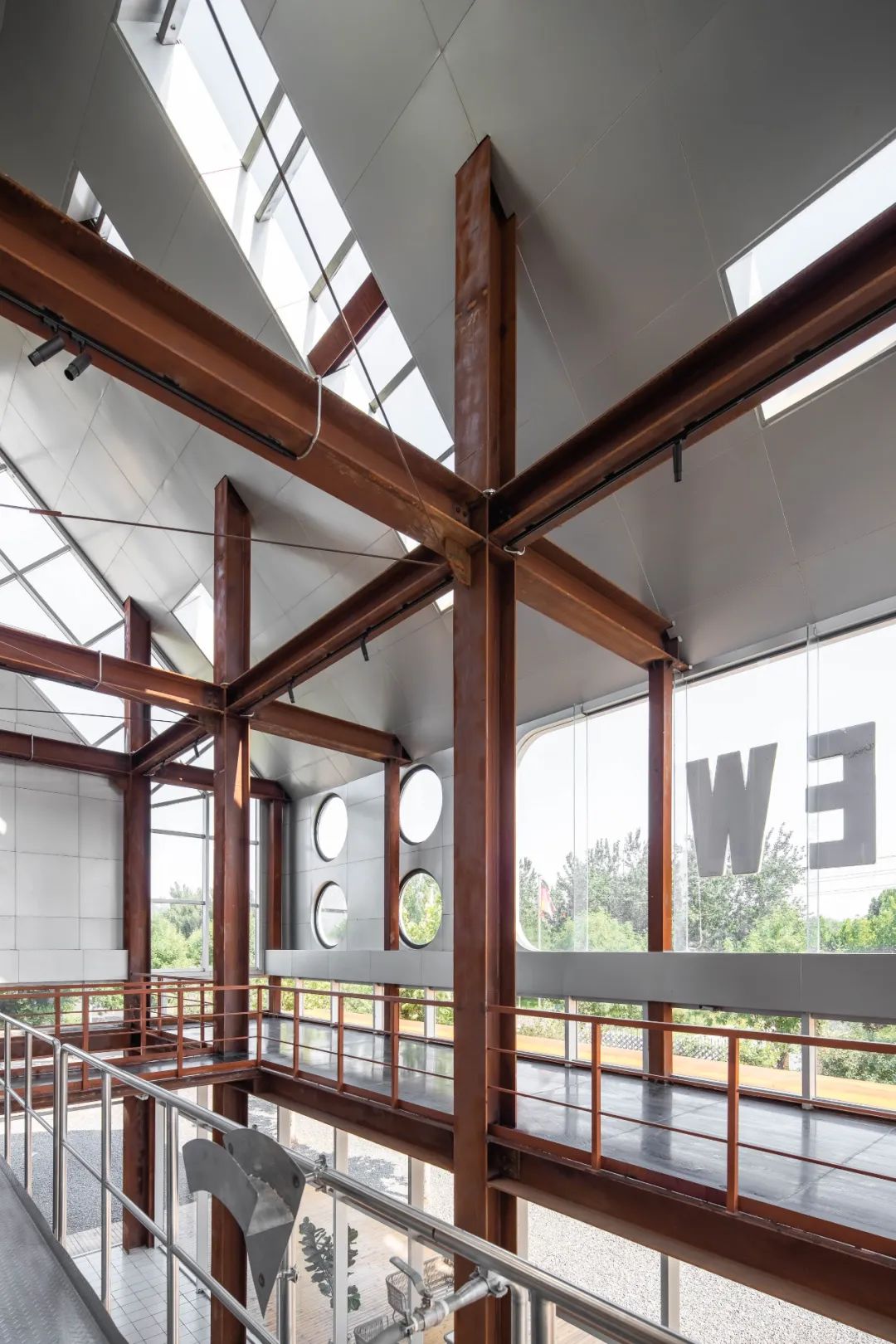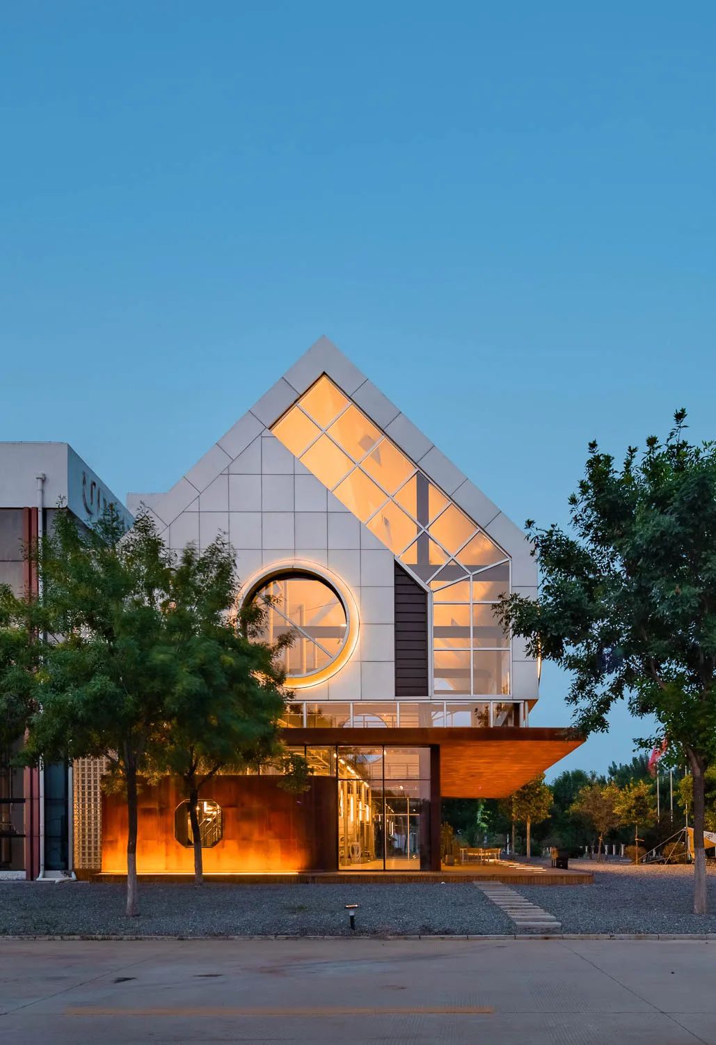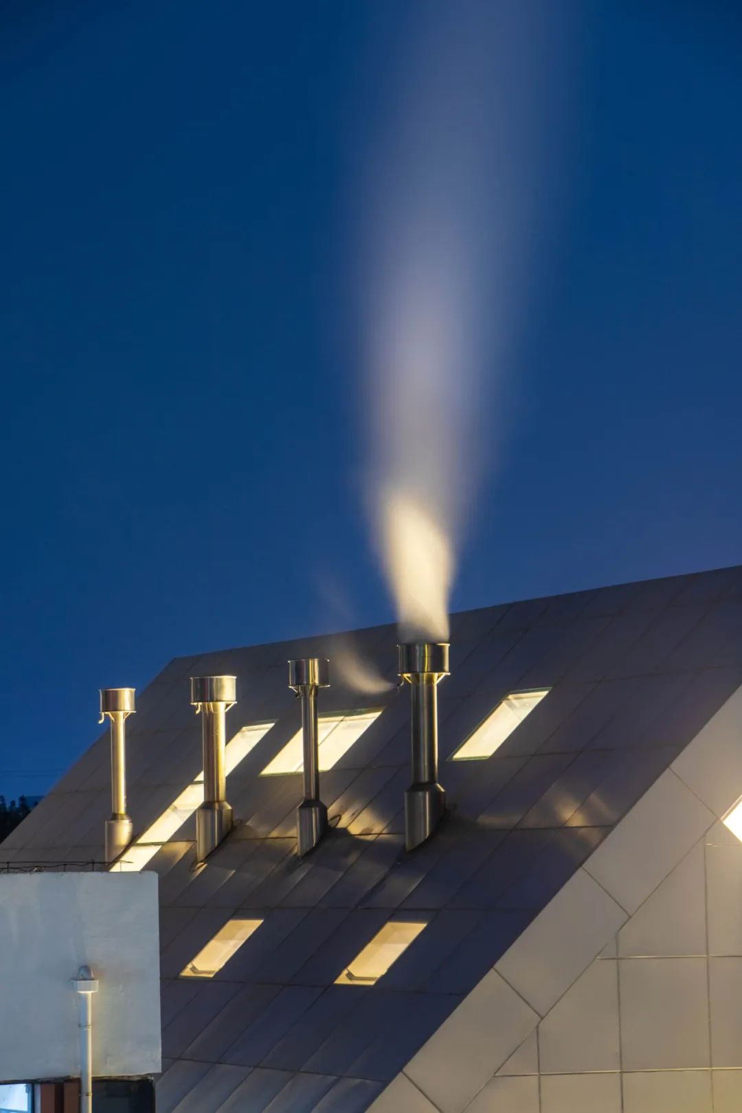 建筑分为上下体块,上半部分为银白色双坡建筑体块,内部为车间操作平台及参观展示平台;下半部分为玻璃方体,内部为基础操作区。两个体块之间由一层红色耐候钢结构层所划分,让整体建筑呈现出白-红-透明三个层次。由于车间内部常年处于高温高湿状态,建筑主体结构采用耐候钢为主要材料,在耐高温高湿的同时,让结构材料本身成为具有强烈视觉效果的元素。场地周边以简易的碎石作为景观,日常可作为露营地使用。