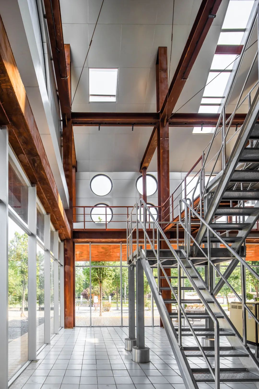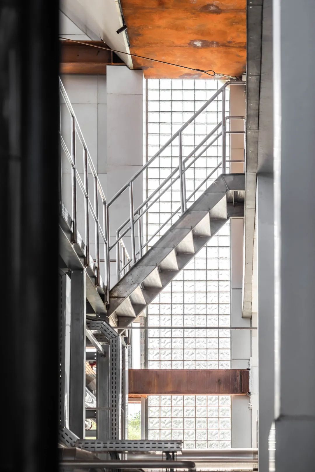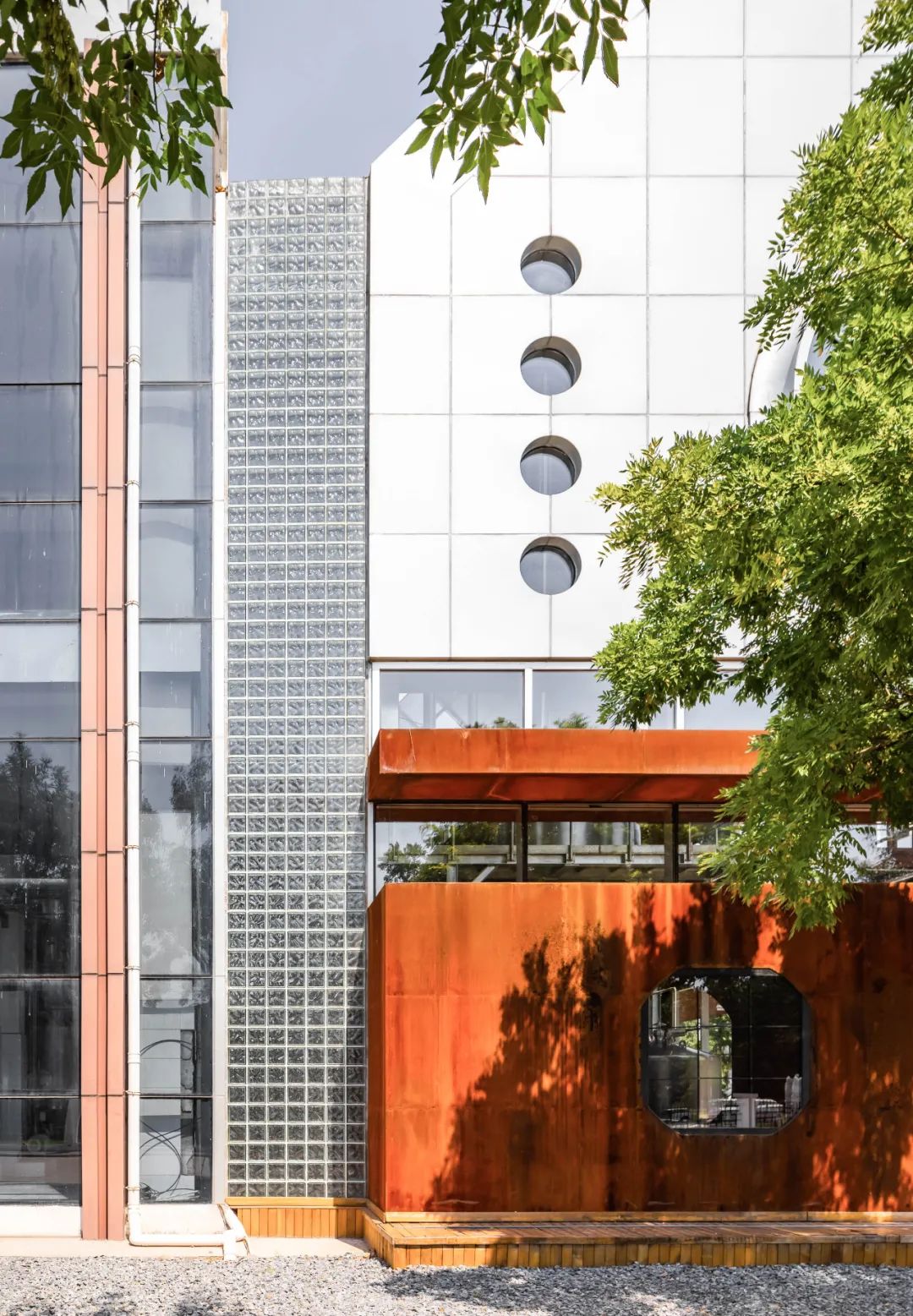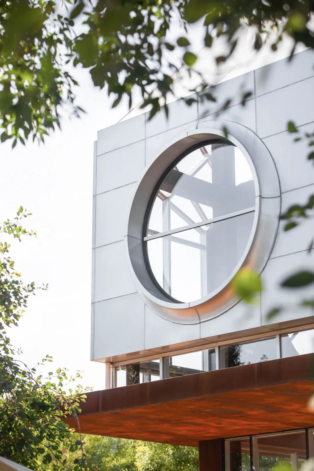 建筑分为上下体块,上半部分为银白色双坡建筑体块,内部为车间操作平台及参观展示平台;下半部分为玻璃方体,内部为基础操作区。两个体块之间由一层红色耐候钢结构层所划分,让整体建筑呈现出白-红-透明三个层次。由于车间内部常年处于高温高湿状态,建筑主体结构采用耐候钢为主要材料,在耐高温高湿的同时,让结构材料本身成为具有强烈视觉效果的元素。场地周边以简易的碎石作为景观,日常可作为露营地使用。