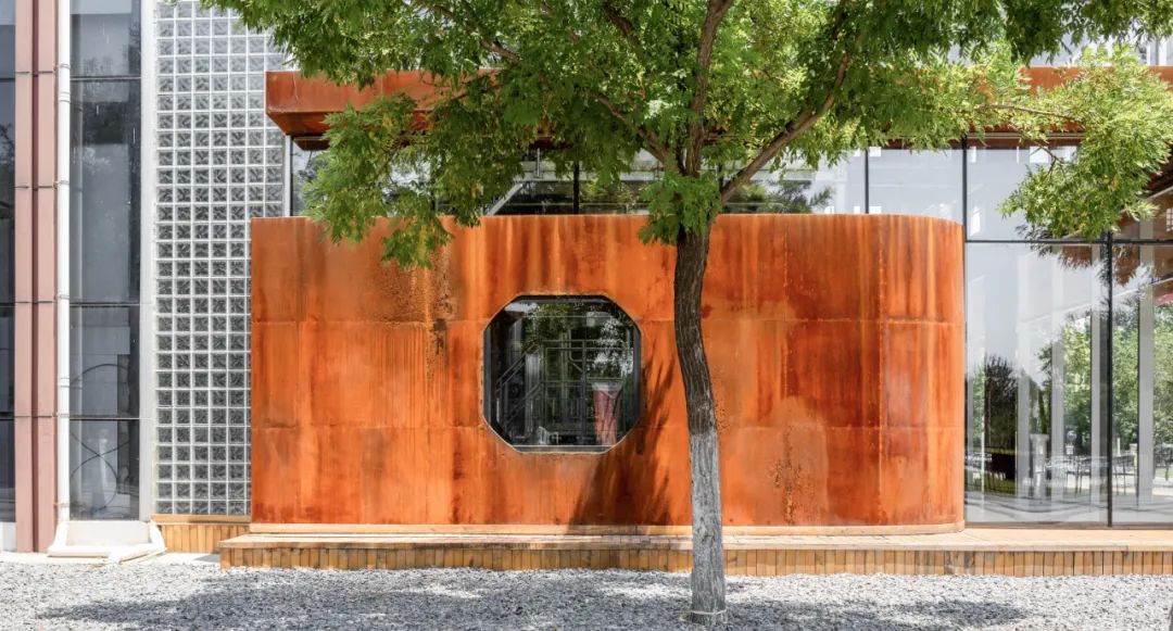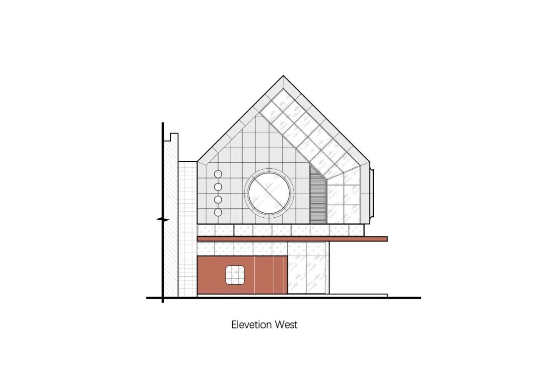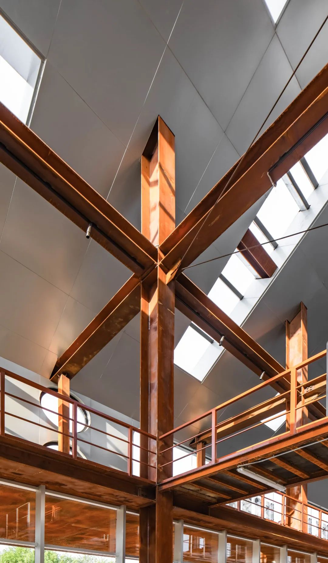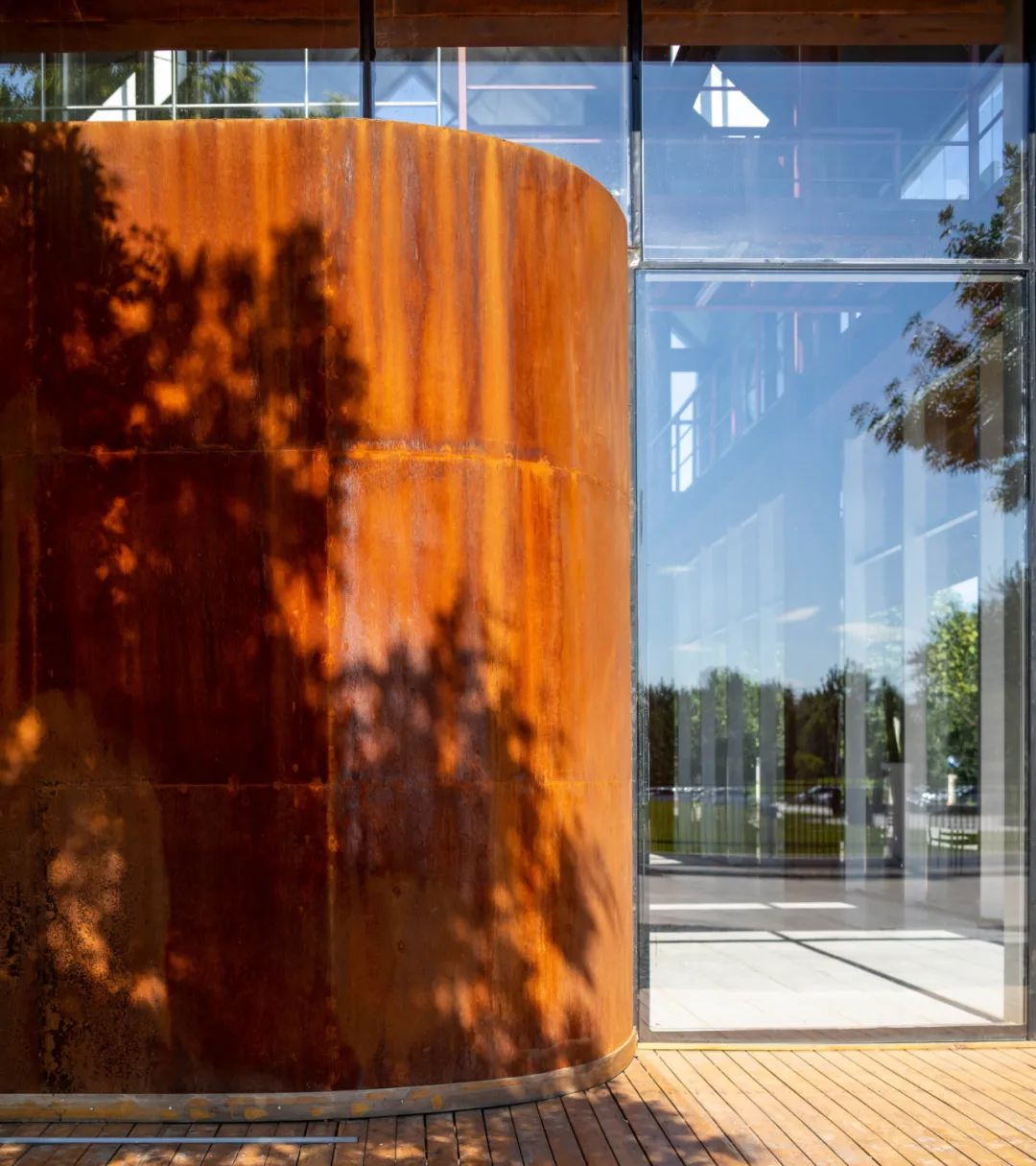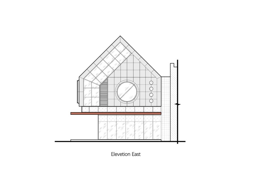 建筑分为上下体块,上半部分为银白色双坡建筑体块,内部为车间操作平台及参观展示平台;下半部分为玻璃方体,内部为基础操作区。两个体块之间由一层红色耐候钢结构层所划分,让整体建筑呈现出白-红-透明三个层次。由于车间内部常年处于高温高湿状态,建筑主体结构采用耐候钢为主要材料,在耐高温高湿的同时,让结构材料本身成为具有强烈视觉效果的元素。场地周边以简易的碎石作为景观,日常可作为露营地使用。