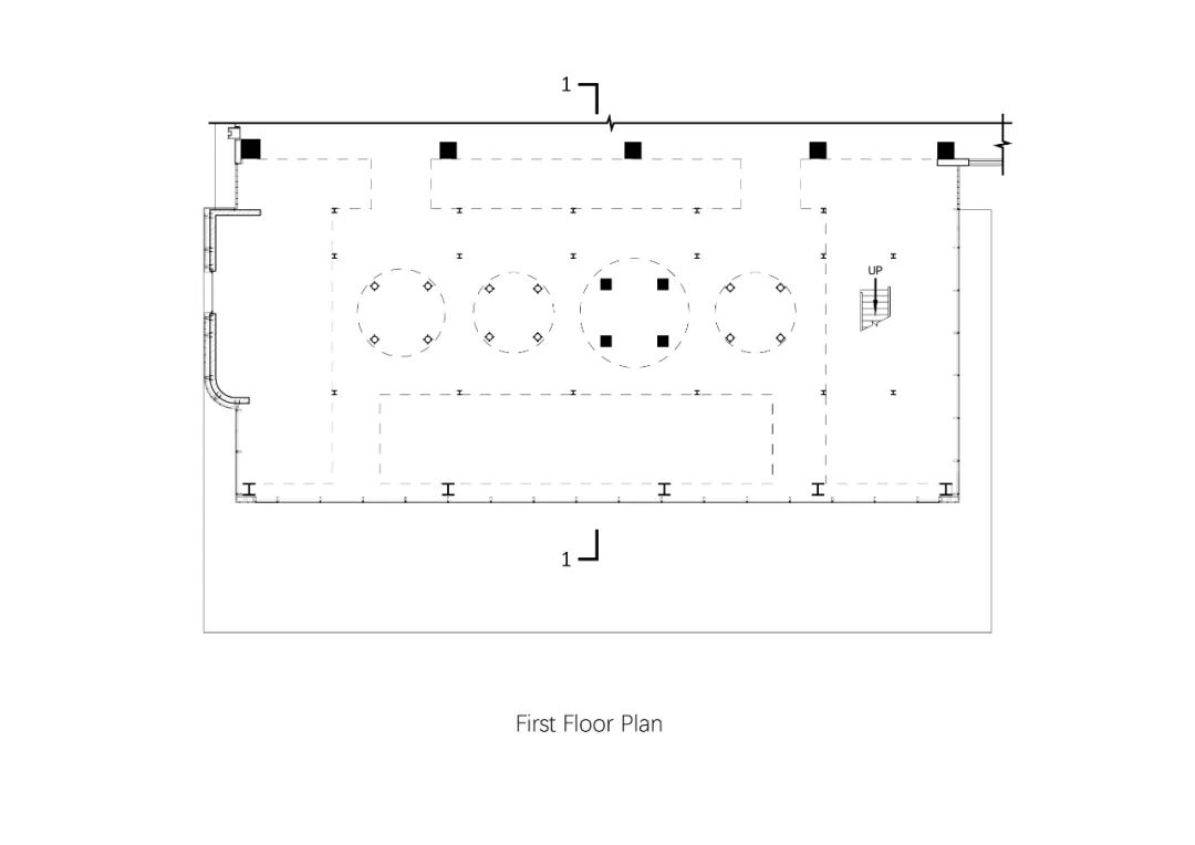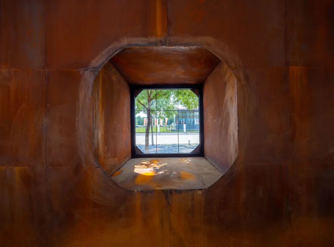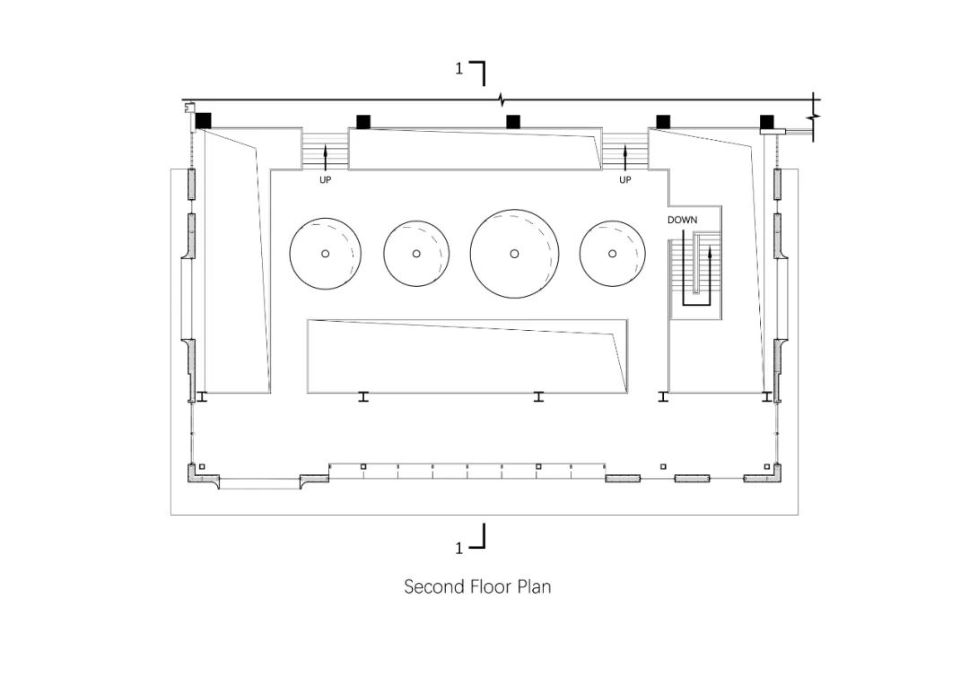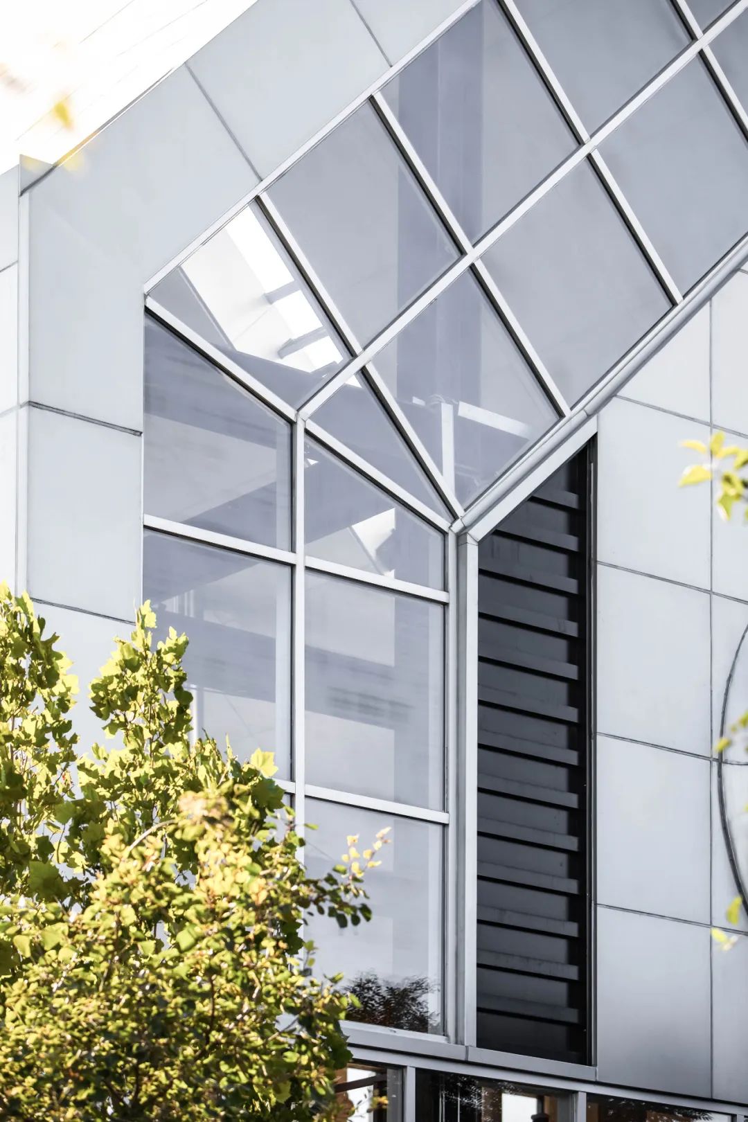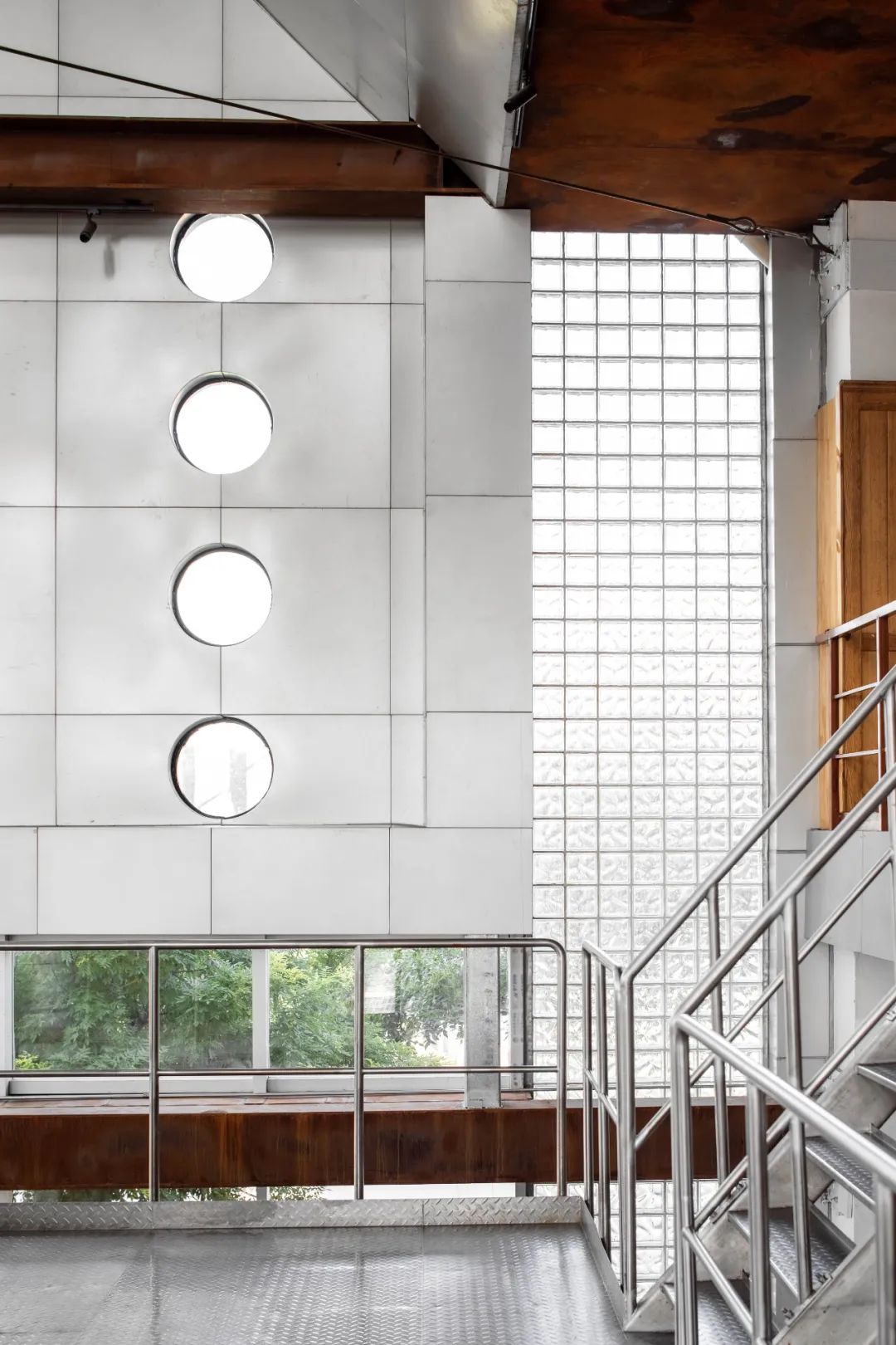 建筑分为上下体块,上半部分为银白色双坡建筑体块,内部为车间操作平台及参观展示平台;下半部分为玻璃方体,内部为基础操作区。两个体块之间由一层红色耐候钢结构层所划分,让整体建筑呈现出白-红-透明三个层次。由于车间内部常年处于高温高湿状态,建筑主体结构采用耐候钢为主要材料,在耐高温高湿的同时,让结构材料本身成为具有强烈视觉效果的元素。场地周边以简易的碎石作为景观,日常可作为露营地使用。