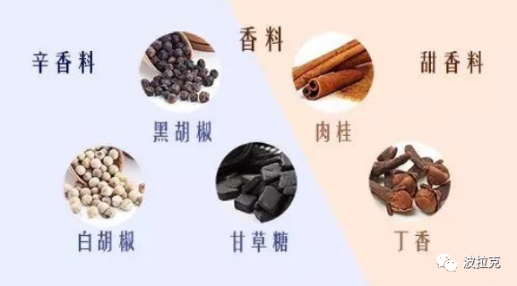 葡萄酒中的香料香气来自于葡萄品种、橡木桶和泥土气味等,主要的香料香气有月桂、胡椒、桂皮、姜、甘草、薄荷等。