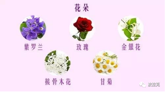 主要的花香有以下几种堇菜、山查、玫瑰、柠檬、茉莉、鸢尾、天竺葵、洋槐、椴树等。