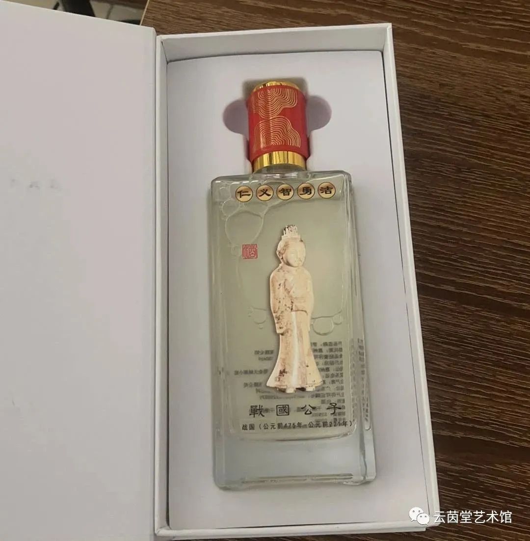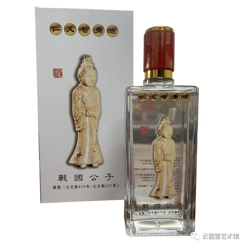 这款白酒的包装设计源于中国历史悠久的文化遗产,以战国玉人俑为原型,精心设计而成。包装上标注了战国公子代表玉人俑人物,图案细节之处还体现了古代玉雕技艺的精湛和细腻,尽显其历史和文化的价值。