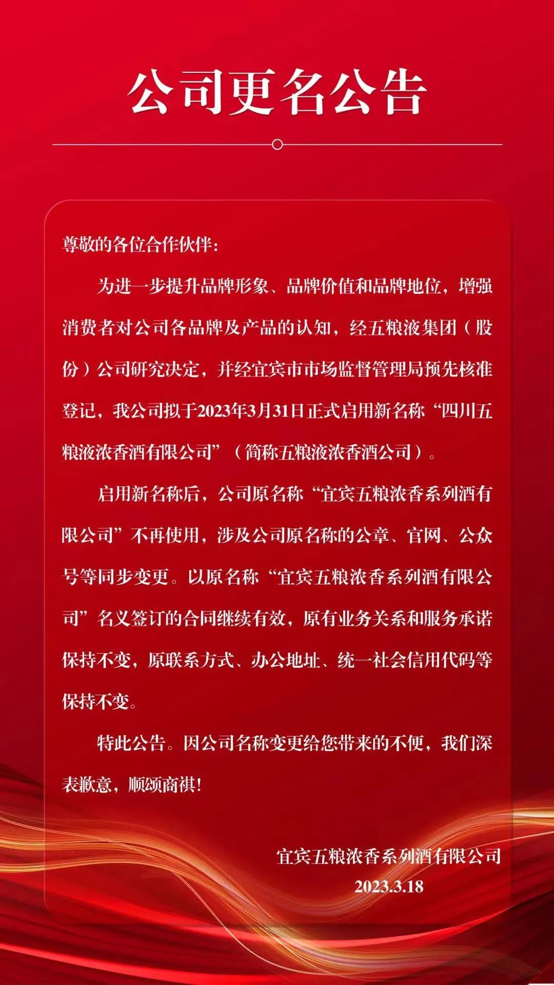 3月18日,宜宾五粮浓香系列酒有限公司发布公告称,经五粮液集团(股份)公司研究决定,且预先经宜宾市市场监督管理局核准登记,公司拟于2023年3月31日正式启用新名称“四川五粮液浓香酒有限公司”(以下简称五粮液浓香酒公司)。