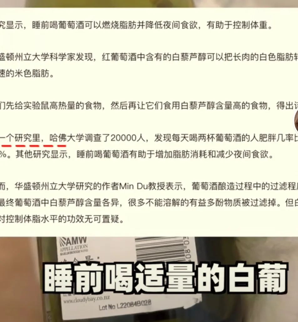 原本对于这类剑走偏锋的说辞我总是一笑而过,因为给我第一感觉就是离了个大谱,标题就太像谣言了。可是再看一眼,视频中出现了一些专业的名词,而且在行文上似乎是有逻辑的,在第一眼看过去的时候竟没能判断真伪,这让我点燃了那该死的胜负欲。视频中说:“研究显示,睡前喝葡萄酒可以燃烧脂肪并降低夜间食欲,有助于控制体重……华盛顿州立大学科学家发现,红葡萄酒中含有的白藜芦醇可以把长肉的白色脂肪转换成为代谢迅速的米色脂肪……哈佛大学调查了 20000 人,发现每天喝两杯葡萄酒的人肥胖几率比其他人低 70%……”然后视频下方是建议每天睡前喝适量白葡萄酒。这个视频文案颇具有欺骗性,我们从三个方面来击破:一是其有着非常明显的断章取义和偷换概念的文案,二是被点名的“白藜芦醇”的真实功效,三是这篇文案最愚蠢的地方。