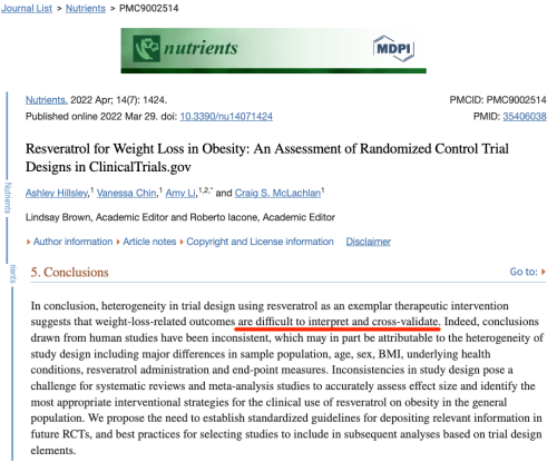 - Hillsley A, Chin V, Li A, McLachlan CS. Resveratrol for Weight Loss in Obesity: An Assessment of Randomized Control Trial Designs in ClinicalTrials.gov. Nutrients. 2022 Mar 29;14(7):1424. doi: 10.3390/nu14071424. PMID: 35406038; PMCID: PMC9002514.