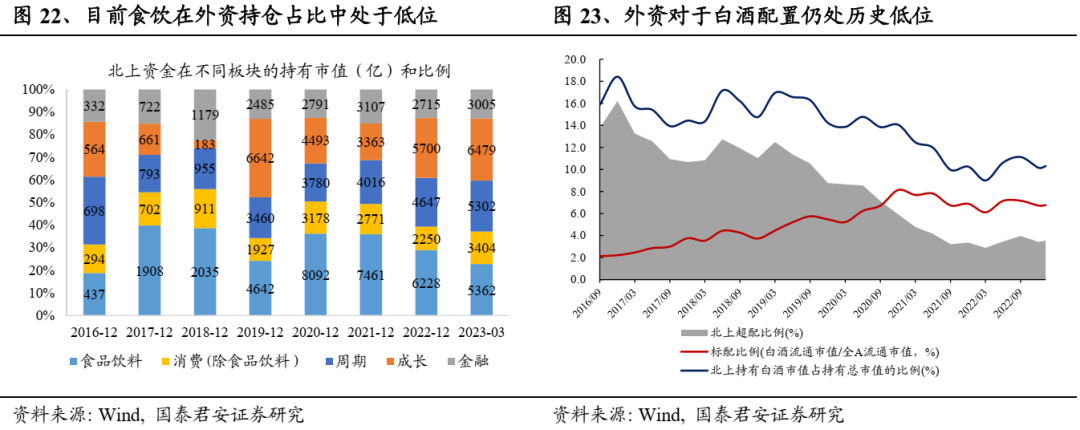 2023年北上资金将对板块估值形成支撑。就外资持仓结构来看,食品饮料在沪港通、深港通所持A股的仓位占比处于2017年以来相对低位,其中外资对白酒超配比例处于2016年以来的相对低位;考虑到经济迈入复苏阶段,2023年白酒板块ROE迈入上行阶段是大概率事件,且板块PE-TTM在40倍以内对外资具备较高吸引力,考虑到2023下半年板块业绩释放,滚动市盈率有望再度落入阈值以内,外资有望再次加速流入。