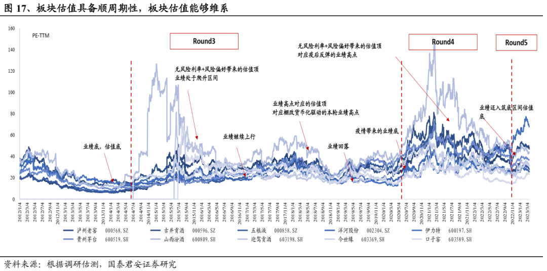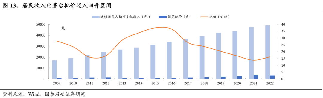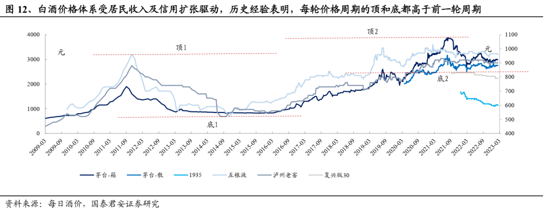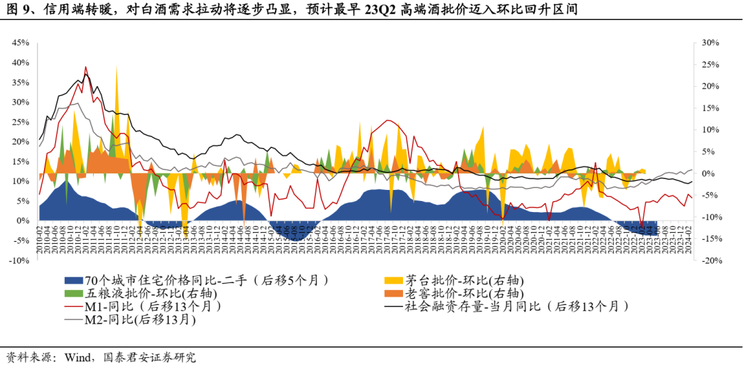 中期维度消费升级逻辑回归,新周期价格天花板将打开。参考历史经验,我们认为白酒商品属性高端化是趋势,其售价与人均收入提升及信用扩张关联度高,伴随居民收入持续修复及信用回暖,消费升级逻辑将回归,新周期将打开价格天花板。