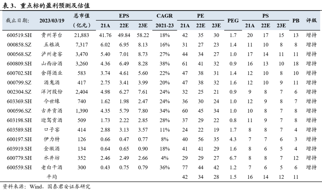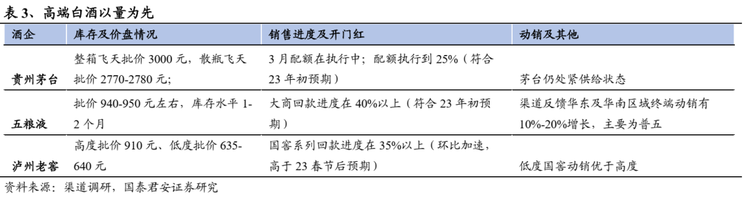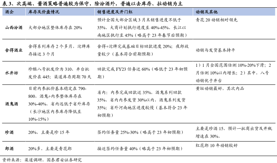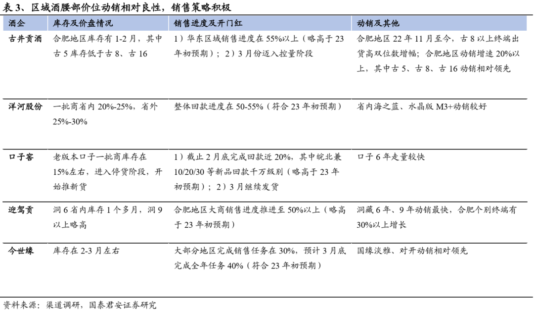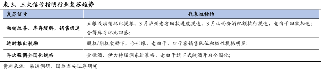 三方面信号表明产业复苏趋势明确。1)动销转暖、库存缓解,销售提速:根据各地、各渠道调研,1-2月行业终端动销环比改善较为明显,大部分企业终端动销有不同程度增长,库存环比22年末有较为明显下降,个别标的回款进度高于23年初预期;2)酒企适时推出激励:节后大部分酒企销售队伍对经营形势评估更加积极,其中,老白干、今世缘等销售队伍在22年推出激励,口子窖亦在23年3月推出激励,强激励下队伍积极性提振明显,我们认为推出激励行为表明行业筑底回暖,企业希望调动队伍积极性来及时捕捉行业上行机遇;3)区域龙头再次强调全国化:调研反馈23年金徽酒、伊力特、武陵等酒企重新强调全国化战略。