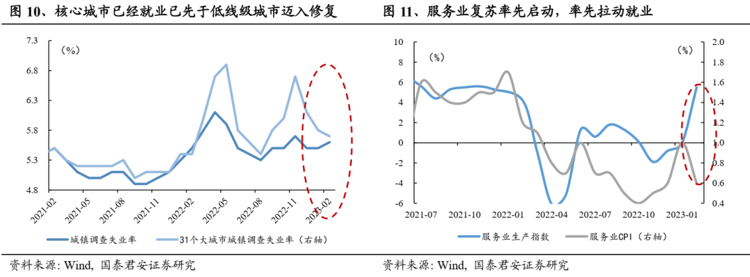 信用端支撑效应凸显、服务业率先拉动就业改善,看好白酒后续复苏趋势。就经验数据来看,社融及M1、M2同比增速领先于高端酒批价环比波动近1年,上述三项指标自22年下半年边际转暖,根据历史经验来看,信用端转暖对白酒价格的支撑作用已经凸显,预计最早23Q2高端白酒价格体系将迈入环比回升区间。考虑到22年末疫情管制政策变动后服务业复苏势头良好、率先拉动就业,23年初以来核心城市失业率逐步下探,后续低线城市就业有望迈入改善区间,展望后续,制造业对于就业贡献有望跟上,居民收入改善有望加速,我们看好白酒后续复苏斜率。