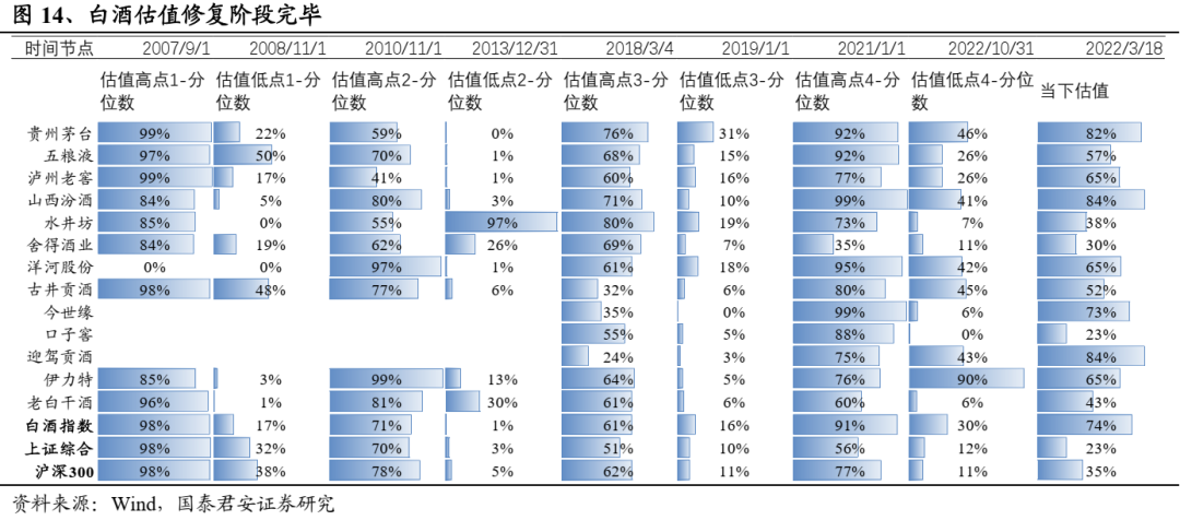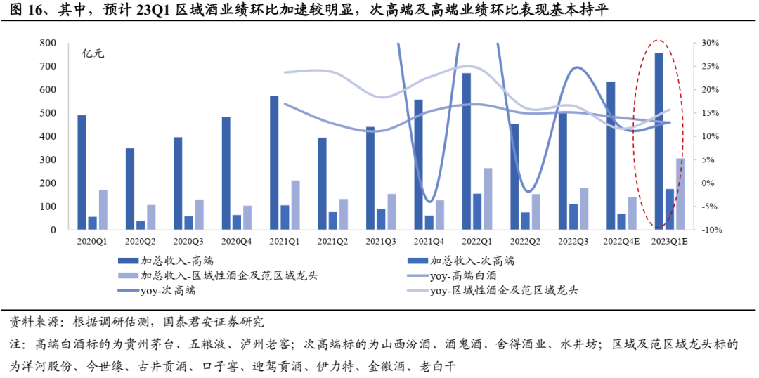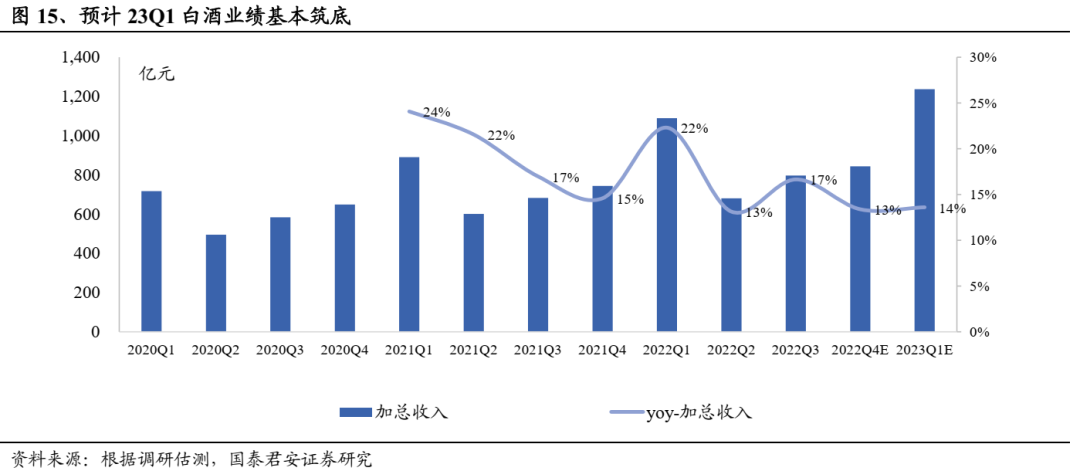 截止目前,大部分标的估值分位数修复至50%以上,我们判断后续估值将持续受到景气支撑。根据调研估测,23年一季度板块业绩大概率筑底,估测主流白酒上市公司23Q1收入同增14%(其中高端、次高端及其他标的23Q1预期收入分别同增13%、13%、16%,高端、次高端业绩环比企稳,区域酒环比加速较明显),考虑到板块估值的顺周期性,当下市场对经济环比修复预期较强,后续板块估值将得到支撑。