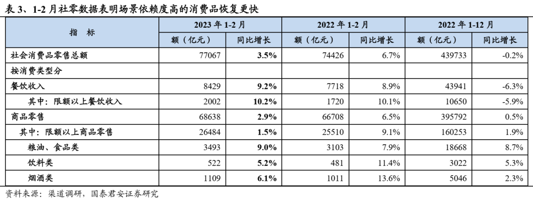 复苏仍处第一阶段,主要受场景驱动。我们认为该阶段白酒复苏仍有明显的场景驱动特征,以1-2月社零数据为证,餐饮收入表现好于商品零售,场景依赖度高的消费恢复更快,同时期内物流、客流数据环比改善较为明显,映射到白酒消费中,回暖最快价位为腰部价位单品,与宴席及旺季返乡等活动关联度较高。