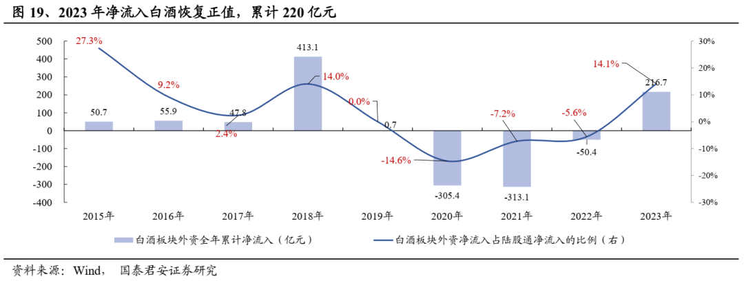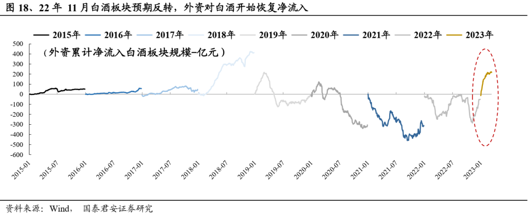 自22年11月开始,白酒板块预期反转,外资对白酒恢复净流入,截止2023年3月中旬,23年外资净流入白酒板块累计近220亿元,自2019年以来首次恢复年度净流入状态。