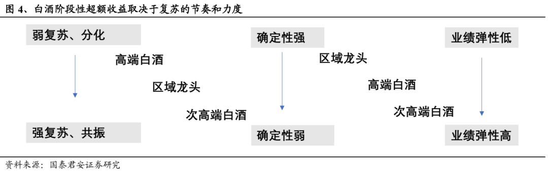 白酒需求回补后复苏节奏成为板块交易的核心要素。市场对白酒复苏节奏有分歧,如果后续白酒呈现强复苏,高端、次高端白酒业绩弹性凸显,对应标的超额收益明显,但如果白酒呈现弱复苏,高端及区域、泛区域龙头业绩确定性凸显,相对收益或更明显。同时,市场对于白酒需求修复的天花板,特别是价格的天花板存疑,对新周期产品结构是否能重新向上、消费升级逻辑能否回归存有分歧。