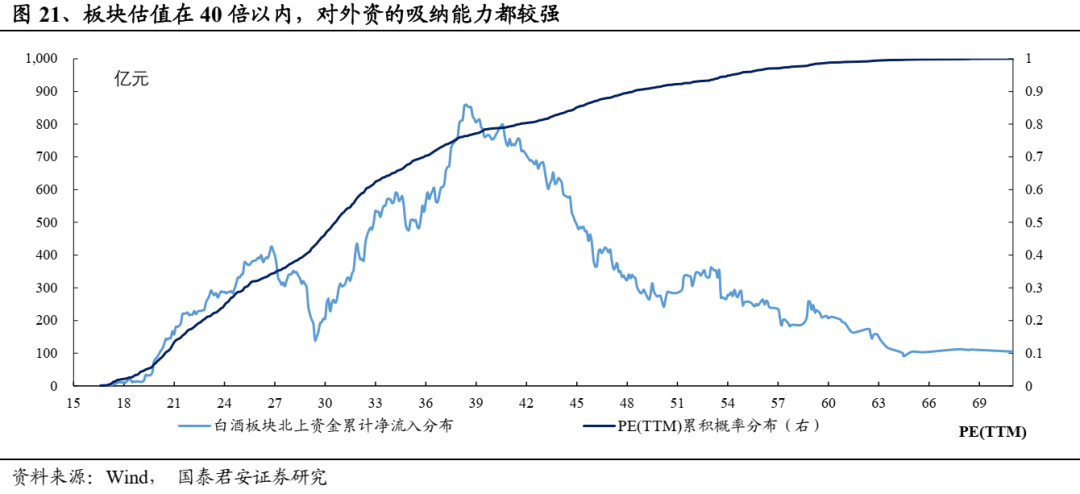 复盘北上资金对白酒板块配置模式,ROE和估值水平构成北向卖卖的核心要素。其中,第一要素为ROE:外资持有白酒股流通市值比重与白酒板块ROE高度正相关,当ROE处于上行期,外资往往呈现趋势性流入;第二要素为估值水平:自沪港通、深港通开放至今,在ROE上行的前提下,外资对白酒估值的买入阈值约为40倍PE-TTM,在40倍以内外资对白酒板块将采取持续买入的策略。