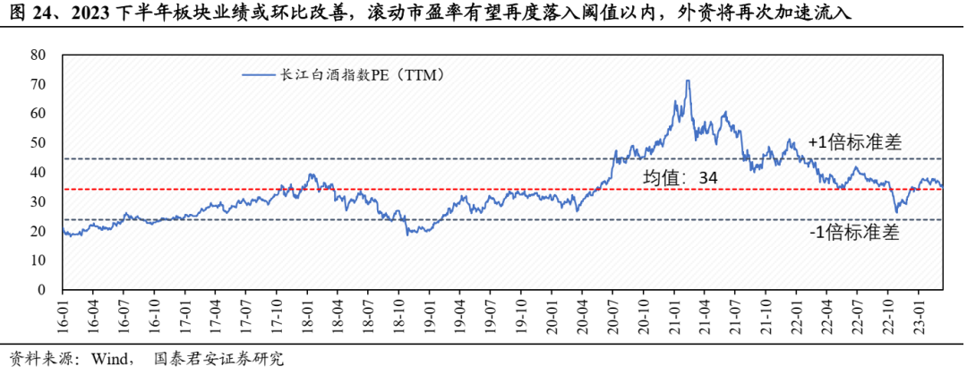 景气上行、北向资金流入,板块上行趋势确定。复苏预期驱动板块估值修复,当下复苏趋势确立,我们预计23年一季度业绩基本筑底,后续迈入环比改善区间,景气上行将支撑估值提升;同时,外资对板块配置关键在于ROE回升,当下板块估值仍在外资配置阈值内,我们判断北上资金对白酒仍有超配空间,ROE回升预期将驱动北上资金持续流入白酒,对估值构成支撑。