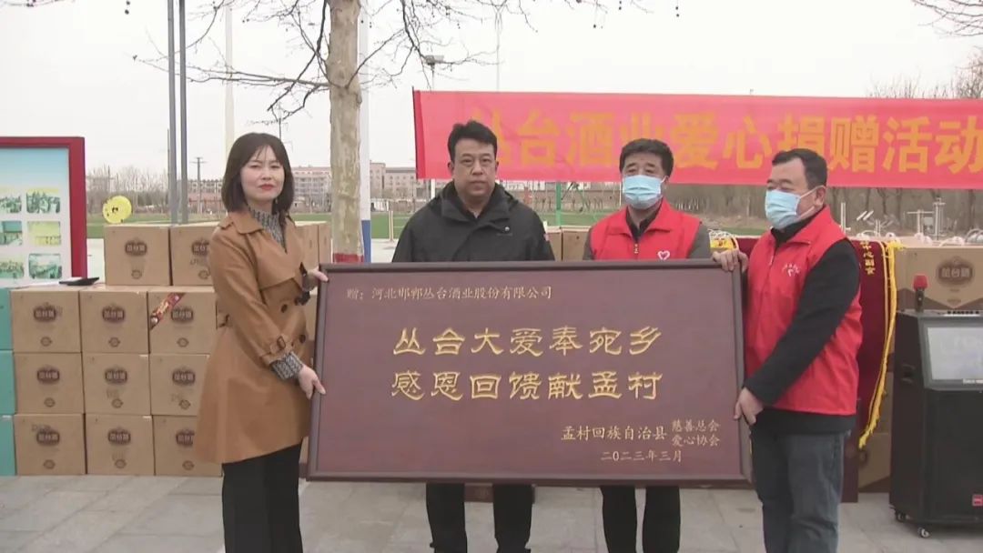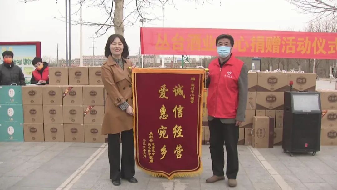 在捐赠活动现场,丛台酒业负责人将价值5万元的酒亲手交到爱心协会负责人手中。爱心协会也将一块写有“丛台大爱奉宛乡 感恩回馈献孟村”的牌匾和一面写有“诚信经营 爱惠宛乡”锦旗交到丛台酒业负责人手中,以此表达对他们的谢意。
