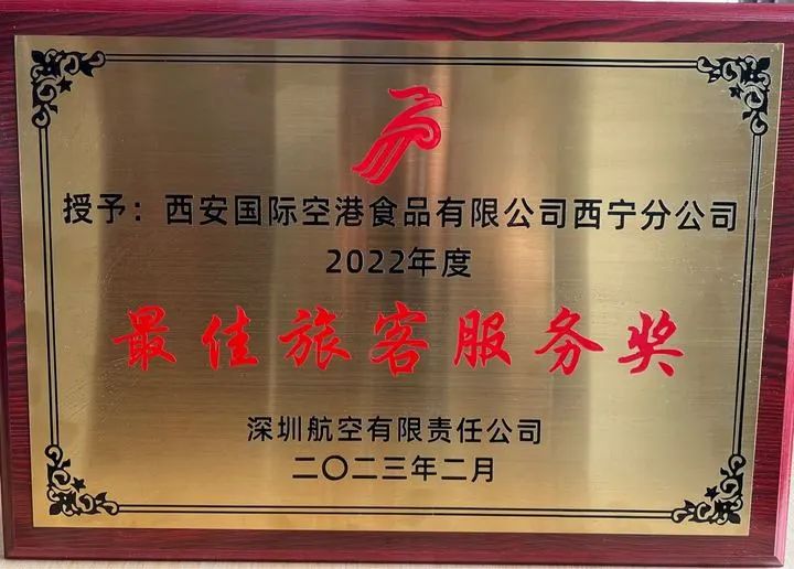 深圳航空公司对空港食品公司西宁分公司航班保障工作和服务质量工作给予充分肯定,双方自建立合作关系以来,公司上下密切配合,严守安全红线、不断提升产品品质,以高效、优质的服务完成2022年深圳航空公司保障任务,获得了一致好评,在深圳航空公司2022年度优秀配餐代理评选中获得“最佳旅客服务奖”荣誉。