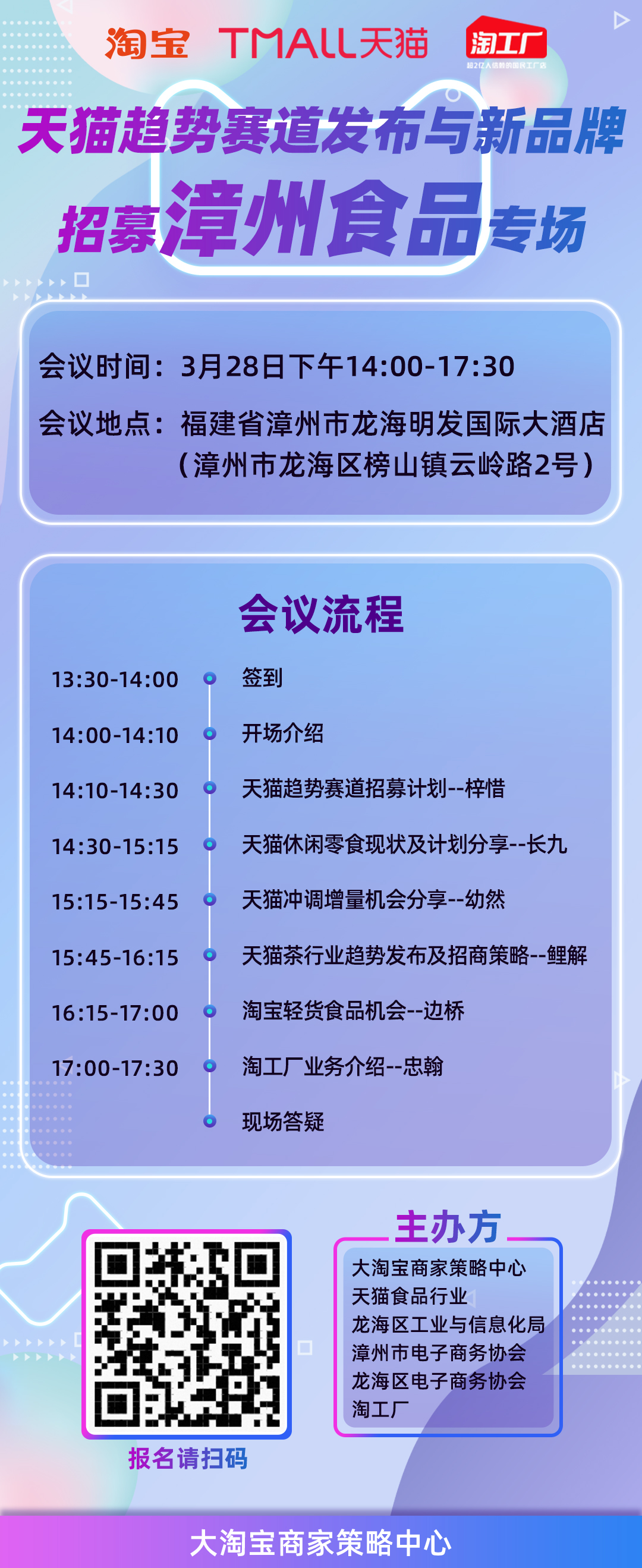 新机会,快增长!3月28日,淘宝天猫食品行业将在漳州市龙海明发国际大酒店(龙海区傍山镇云岭路2号)召开行业分享与招商活动,会议主要内容为23年天猫趋势赛道招募计划,天猫休闲零食,冲调,茶叶,轻食等行业现状与机会分享。欢迎各位新老商家、品牌商,实力工厂等报名参加。