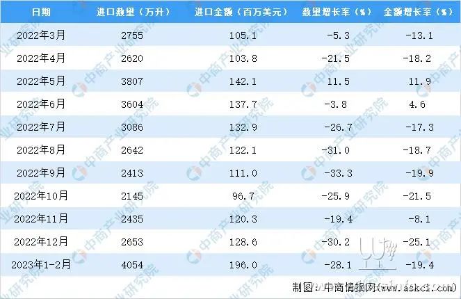 2023年1-2月中国葡萄酒进口量及金额增长情况