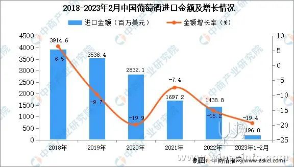 从金额方面来看,数据显示,2023年1-2月中国葡萄酒进口金额196.0百万美元,同比减少19.4%。
