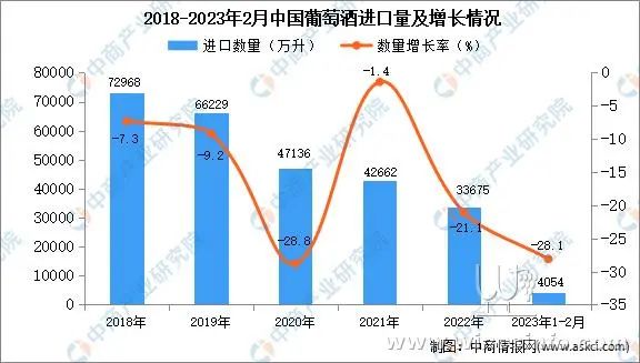 据中商产业研究院数据库显示,近几年,我国葡萄酒进口量呈下降趋势,进口量由2018年的72968万升减少到2022年的33675万升。最新数据显示,2023年1-2月中国葡萄酒进口量4054万升,同比减少28.1%。