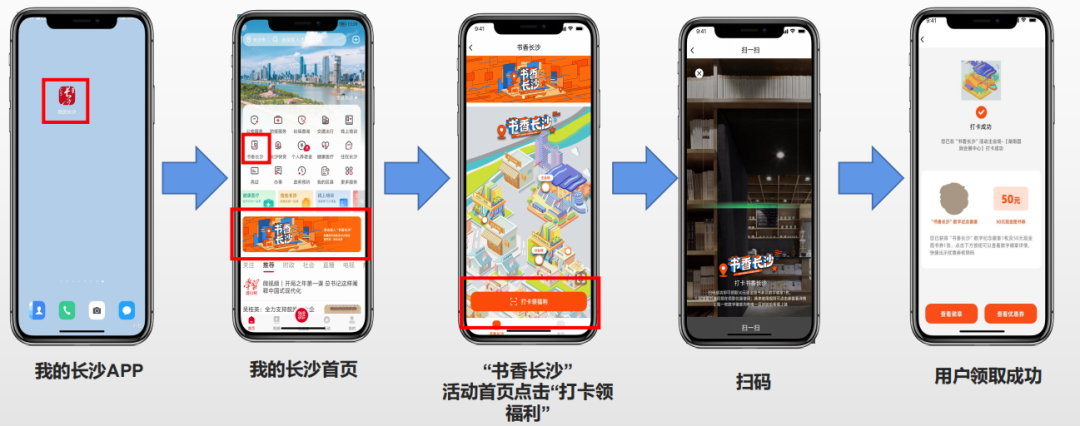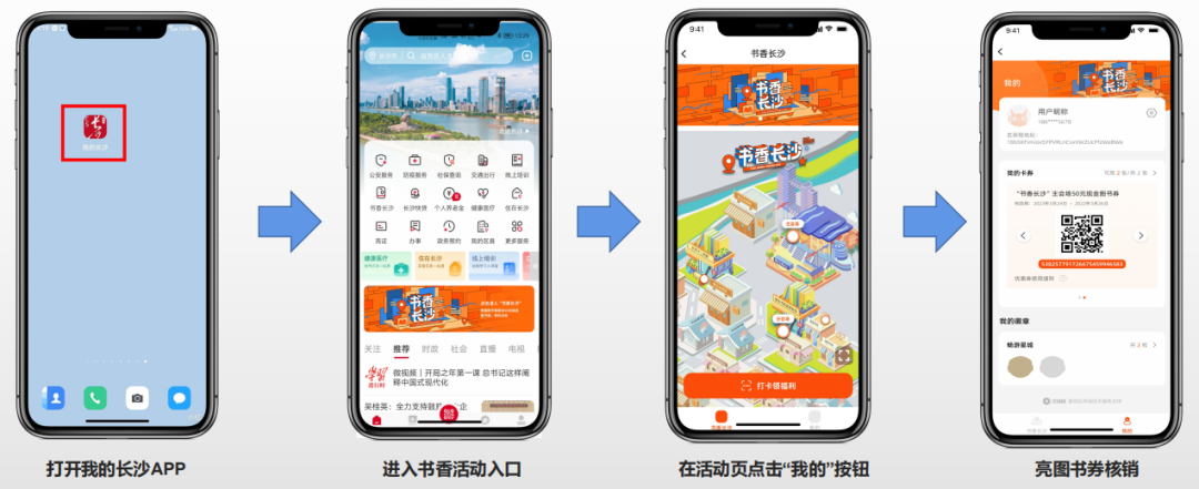 已领券用户实名登录“我的长沙”APP首页,进入“书香长沙”活动后点击“我的”,在“我的卡券”中可查看核销码及图书券详情。