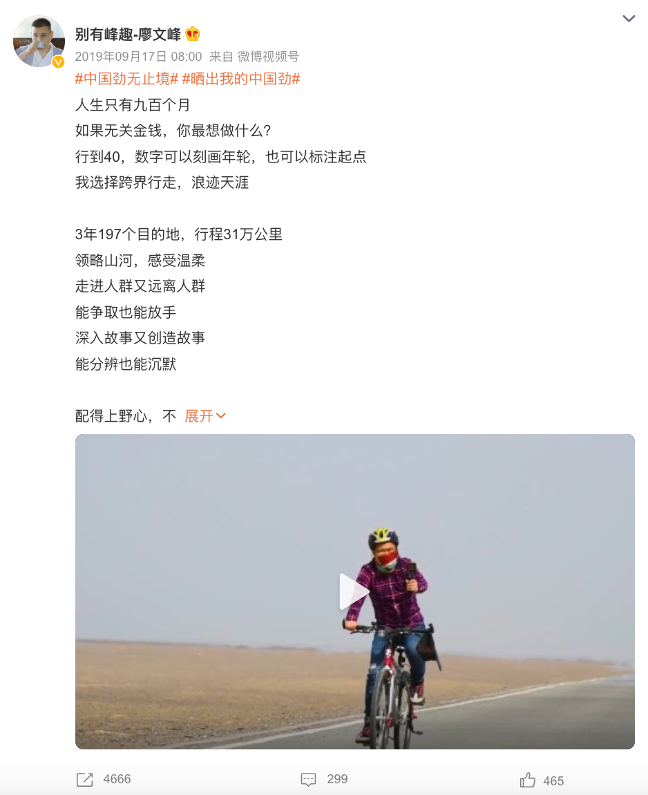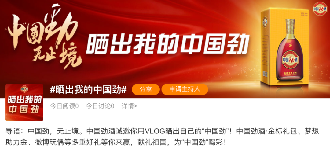 品牌当时发起一场vlog大赛——#晒出我的中国劲#,并设置5个不同的赛道,如“坚持无止劲”、“进取无止劲”。从创意的主要策略来看,这是品牌典型的将品牌名称中的“劲”,与国庆节这样的「大众议题」与「大众情绪」进行了高契合度的捆绑。