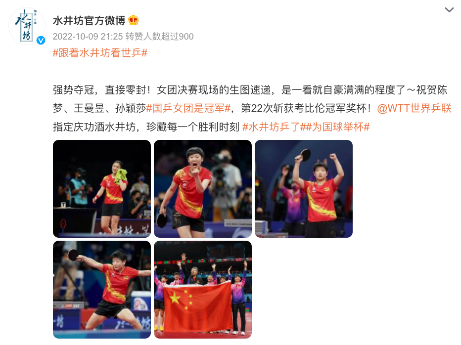 品牌在推出的话题中,就抓住了大众对#国乒女团是冠军#的情绪价值,又利用#跟着水井坊看世乒#的媒体视角,来让用户和品牌产生社交粘性。通过策划系列博文,让用户可以借助社会赛事的热点,关注到一个白酒品牌,同时还乐于和品牌为伍,一起观赛,一起为中国乒乓女团喝彩,并在这个过程中不断对品牌产生更积极的情绪。