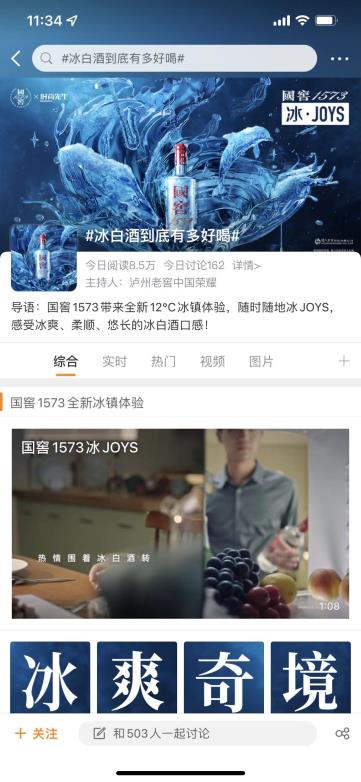 国窖1573,当时在微博推出了一个话题#冰白酒到底有多好喝#,并联手时尚先生Esquire发布了创意微电影《冰·JOYS HOTEL》,同时又针对产品推出了12°C冰镇体验的喝法,这样内容既贴合了夏日情绪,还通过与时尚媒体跨界,抓住喜欢尝鲜体验的年轻人的兴趣点。