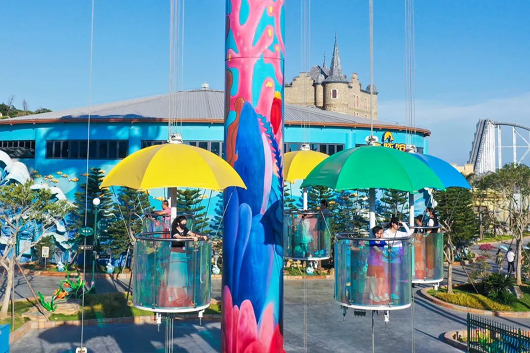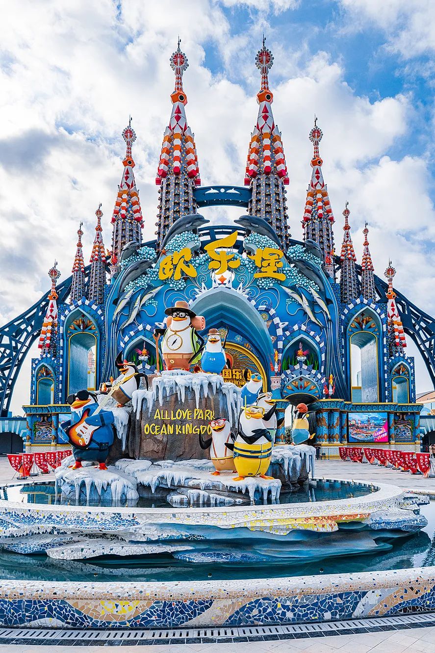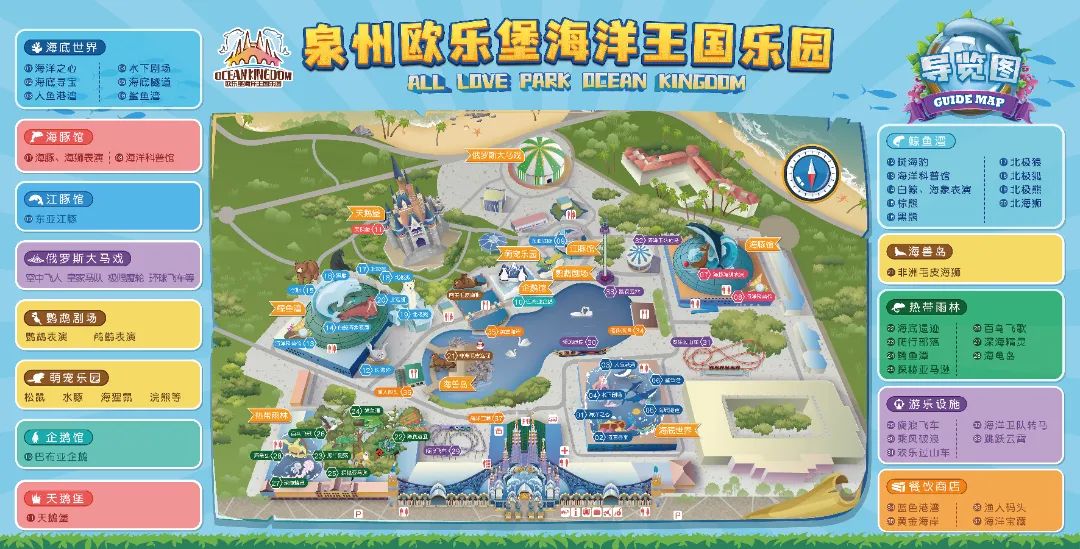 泉州欧乐堡海洋王国乐园以海洋文化为主题,分为鲸鱼湾、企鹅馆、热带雨林、海底世界、江豚馆、海豚馆、天鹅堡、童话世界八大分馆;