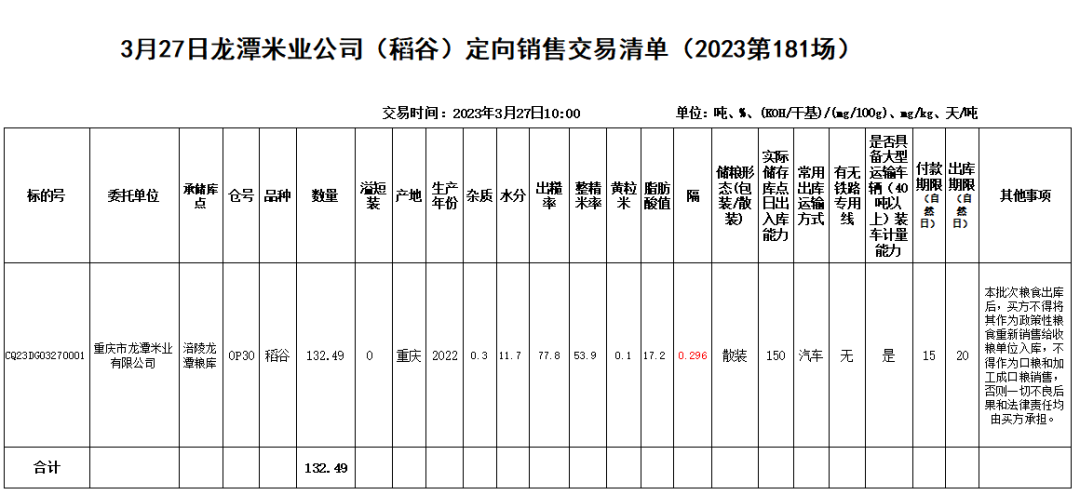 3月27日龙潭米业公司(稻谷)定向销售交易会公告(2023第181场)