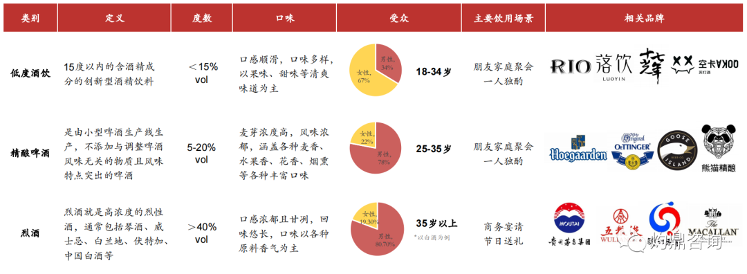 • 精酿啤酒的主要竞品分类为低度酒饮和烈酒。低度酒因为符合年轻人对果味、甜、微醺的追求,迅速抢占年轻消费市场,因此低度酒对于精酿啤酒拓展女性、年轻消费者具有阻碍作用。而烈酒因为长期的品牌与文化效应,在商业宴请的饮用场景方面地位较为稳固,对于精酿啤酒的高端化也存在一定影响。