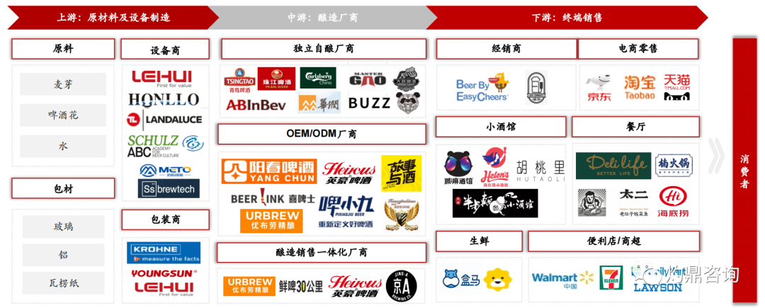 • 精酿啤酒产业链上游包括原材料、设备供应以及包装制造,中游参与者包括各类酿造厂商,下游涉及终端销售。