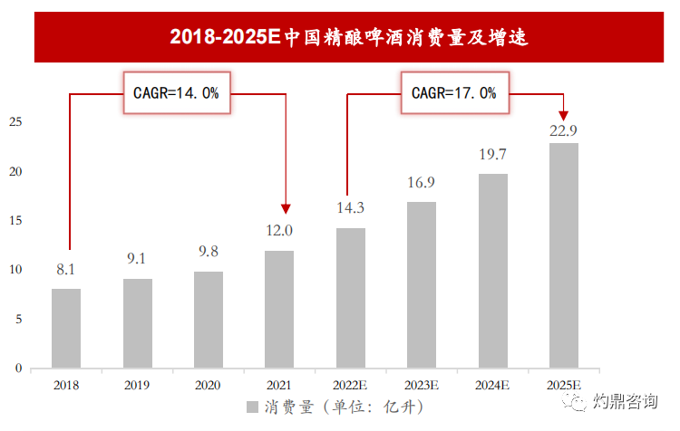 • 精酿啤酒市场呈现出截然不同的局面,消费量以惊人的幅度扩容,增长率居高不下。预计2025年,中国精酿啤酒消费量可达到23亿升,复合增长率约为17%。