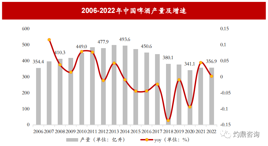 • 2013年,我国啤酒产量达到498.3亿升的顶峰,自此增长率长期维持在负数,啤酒市场进入存量时代。