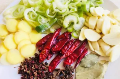 准备一块生姜拍散切成姜块,一棵大葱切成葱段,半头大蒜拍散,放在一旁备用。再来准备适量的香料,一小把茶叶,白芷一块,草寇一棵,香砂仁一棵,草果一棵,桂皮一小段,2-3片香叶,一棵八角,2-3个干辣椒,3-4个陈皮,将这些香料都装在袋子里,装好之后和葱姜蒜放在一起。