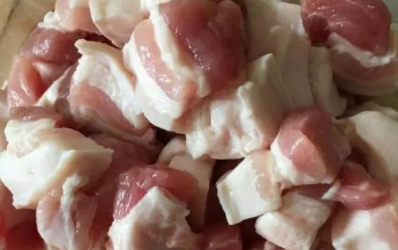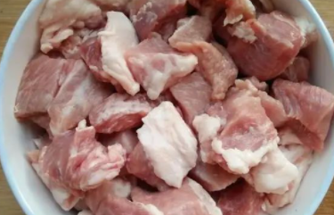 准备一个猪前腿肉,将猪肉放在盆中倒入清水清洗干净,然后将肉放在案板上切成小块,将切好的肉块放在盆中备用。