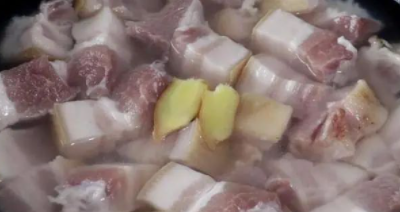 将处理好的肉放在锅中,加入适量的姜片和葱段,倒入少许高度白酒去腥,再加入没过猪肉的凉水,开大火将水烧开,将猪肉焯一下水,水开之后将浮沫捞出来,再继续煮3-5分钟。