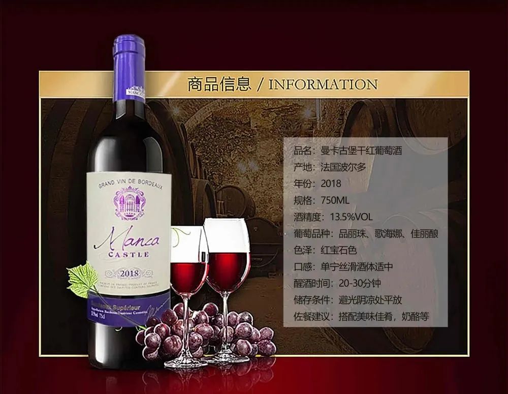 著名产区、知名酒堡、橡木桶贮藏、优质葡萄园等优势,注定这款产品拥有不凡品质。曼卡古堡干红葡萄酒,高端大气的包装,受到众多贵族以及成功人士的喜爱。