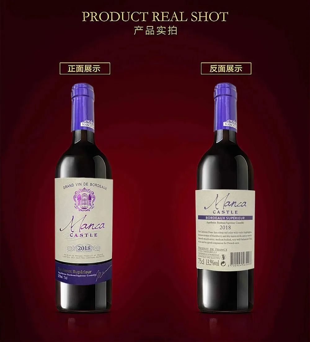 曼卡古堡干红葡萄酒产于葡萄酒圣地——法国波尔多产区,它具有更高级的红宝石色,而且具有浓郁的樱桃和香草气味,香气浓郁醇厚。在得天独厚的气候与地理条件中慢慢成熟,采用传统的葡萄酒酿造法进行桶内成熟,内外兼修。从而造就了曼卡古堡干红复杂、和谐、高雅,柔顺细腻又不失富泽醇厚口感。