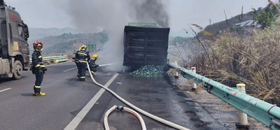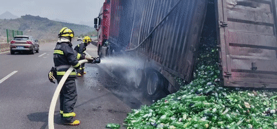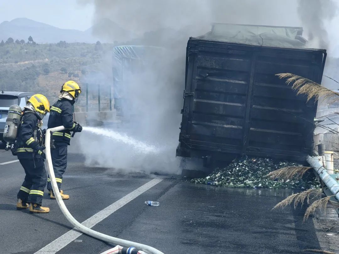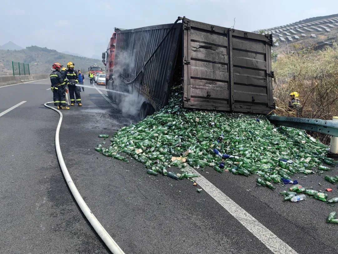 起火车辆为一辆满载啤酒瓶的半挂货车